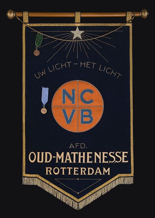 Donkerblauw fluwelen vaandel met applicaties, oranje...