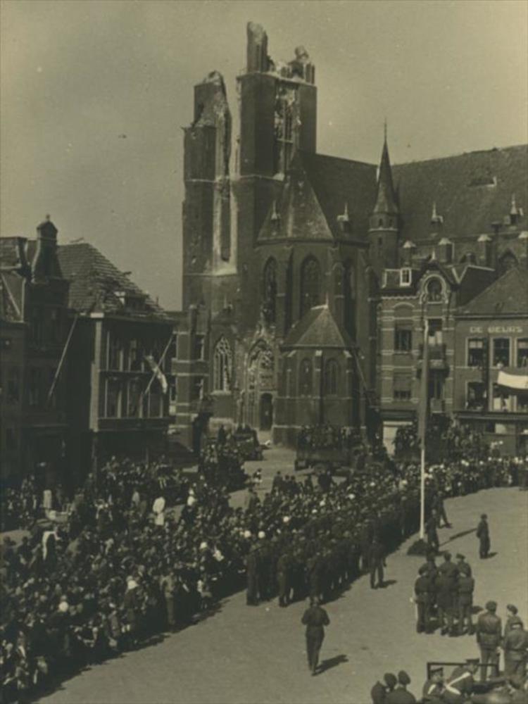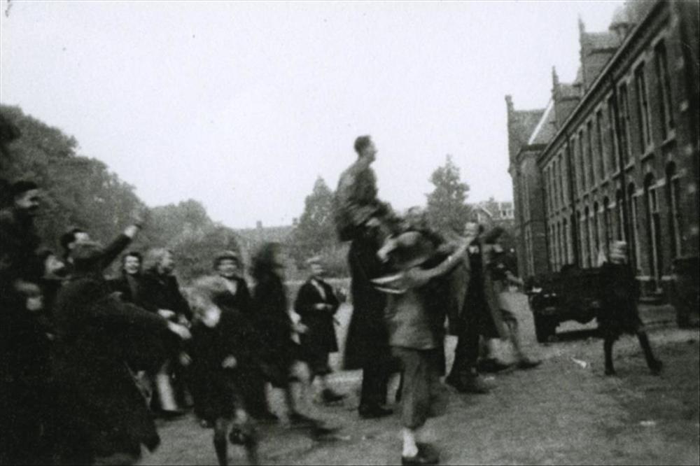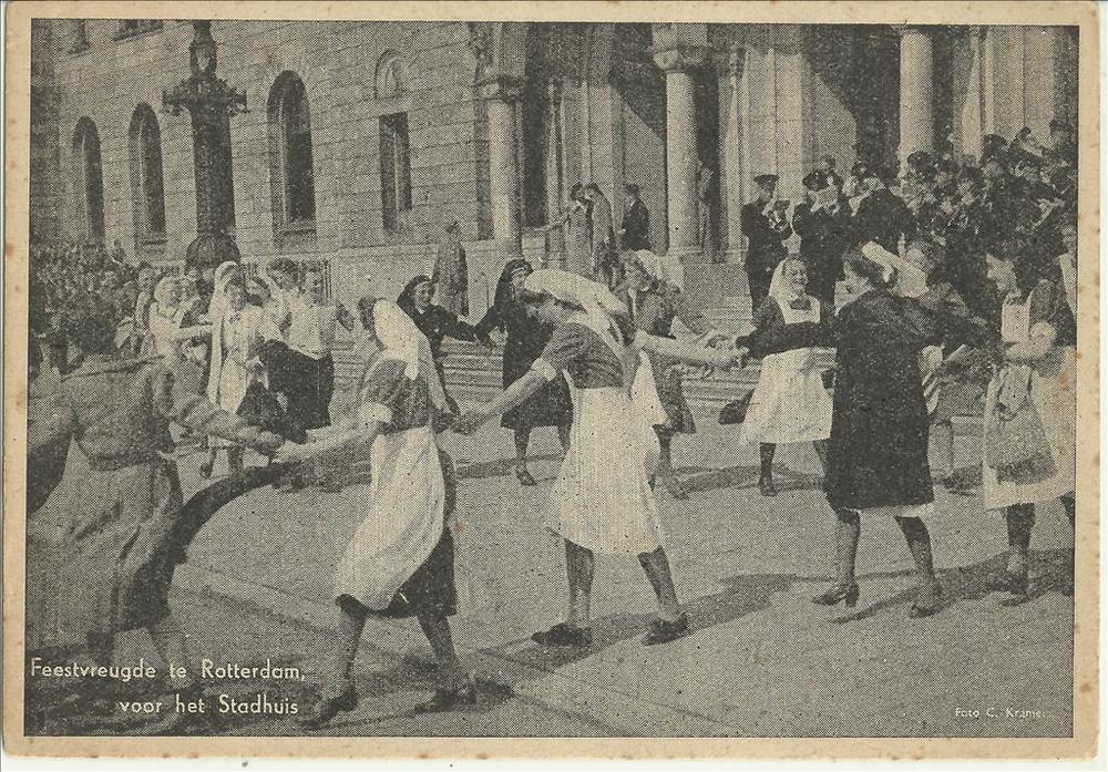 Bevrijding feestvreugde te Rotterdam voor het stadhuis