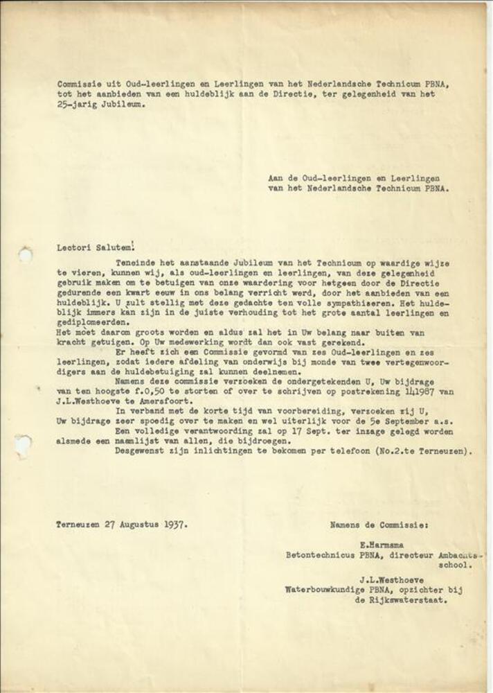 PBNA het Nederlandsch Technicum - brief aan alle oud...