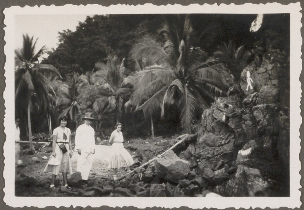 Portret van twee vrouwen en één man aan de voet van ...