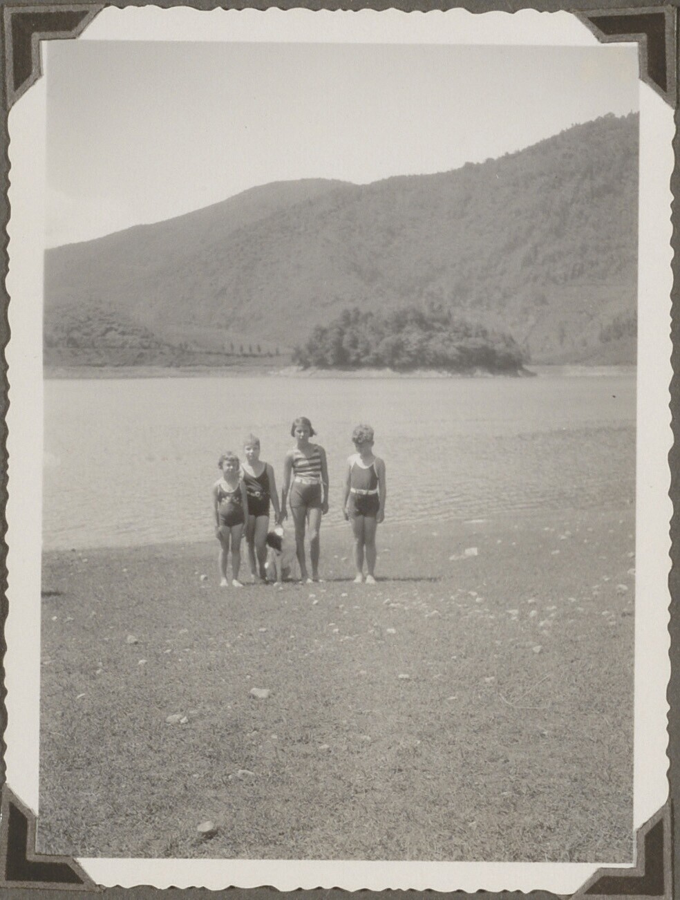 Portret van vier kinderen die aan de rand staan van ...