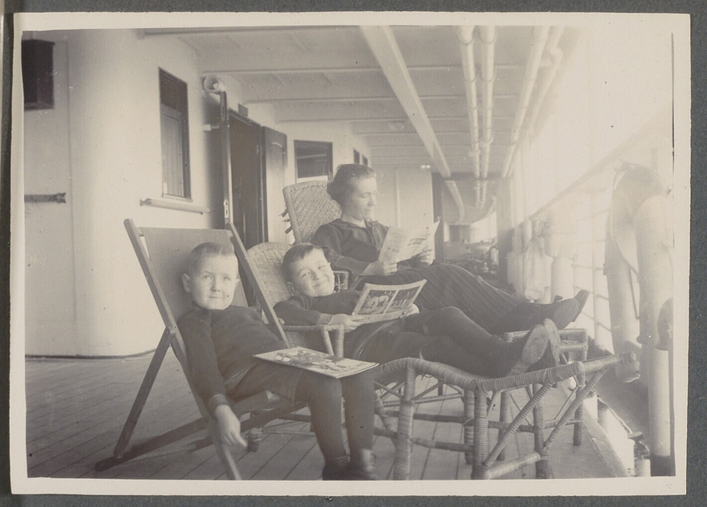 Portret van een vrouw met kinderen op het dek van ee...