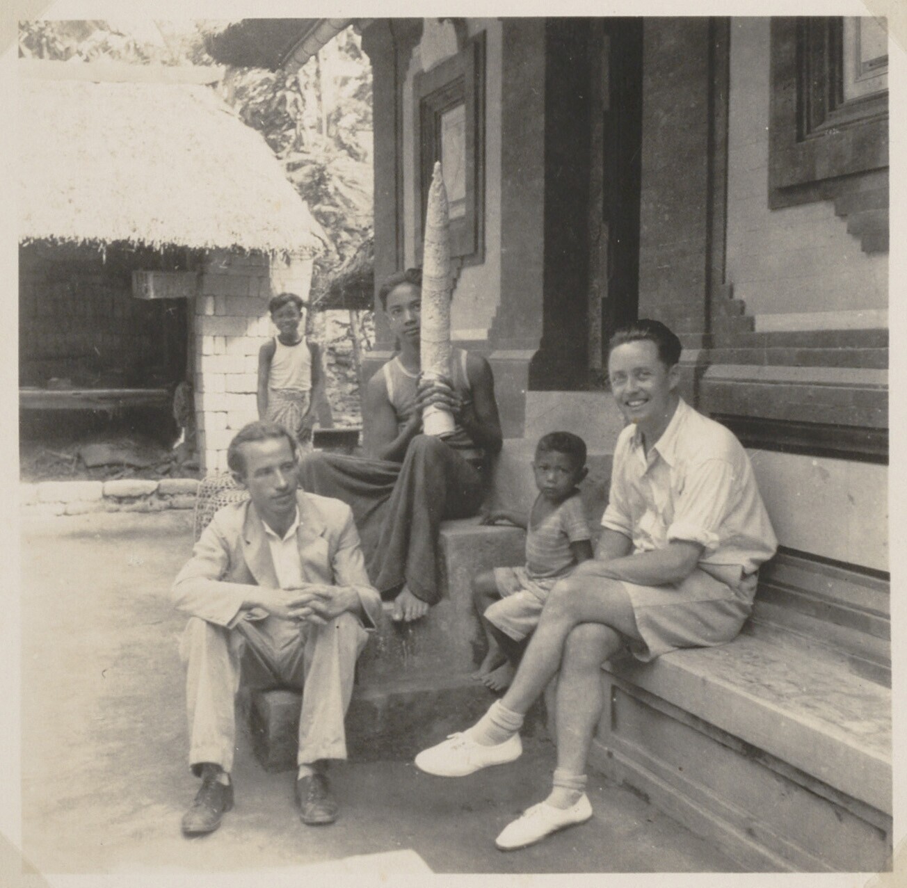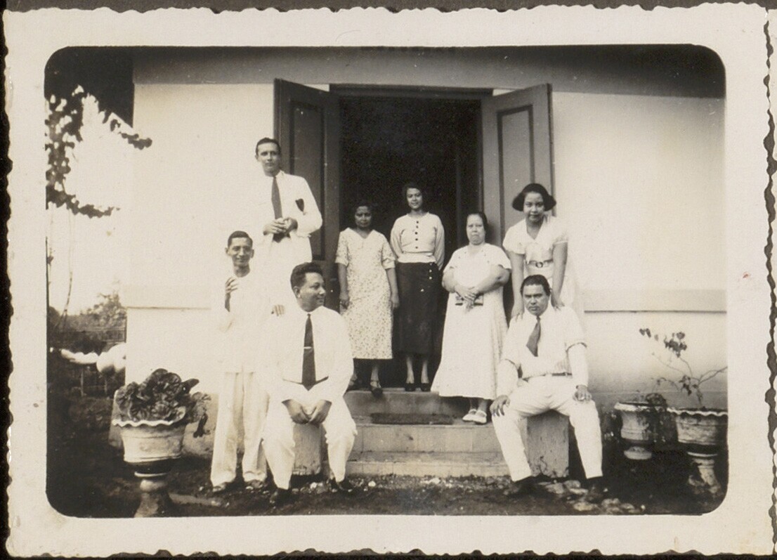 Portret van mannen en vrouwen op de trap van de woning