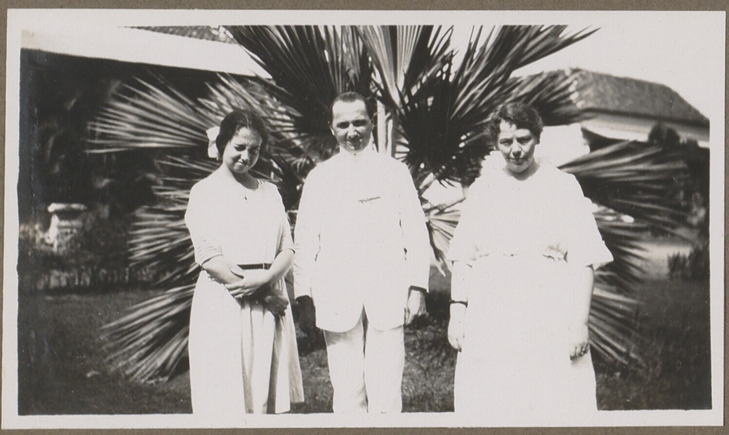 Portret van twee vrouwen en één man op het erf van h...
