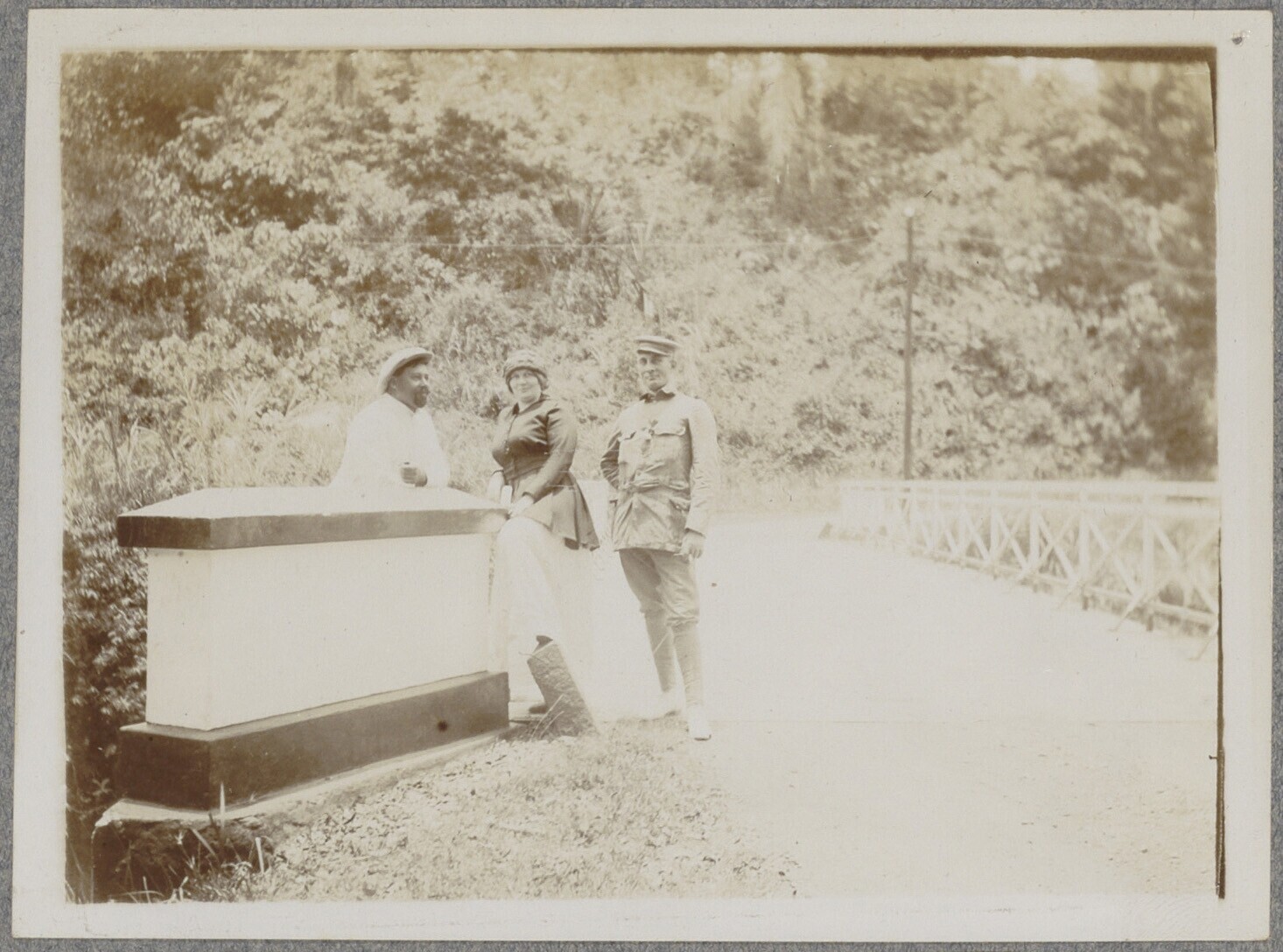 Portret van twee mannen en een vrouw die bij een bru...