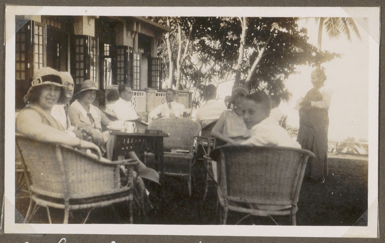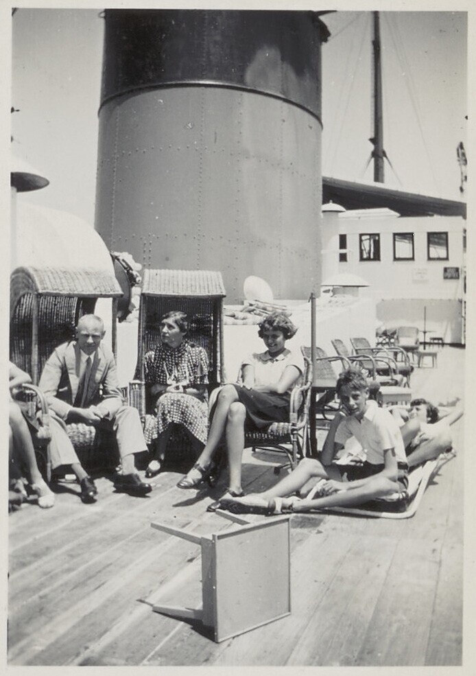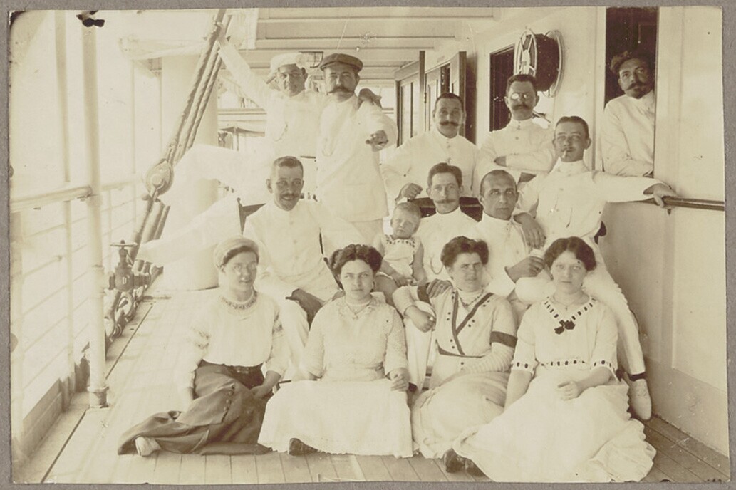 Gezelschap Europeanen aan dek van motorschip Marnix ...