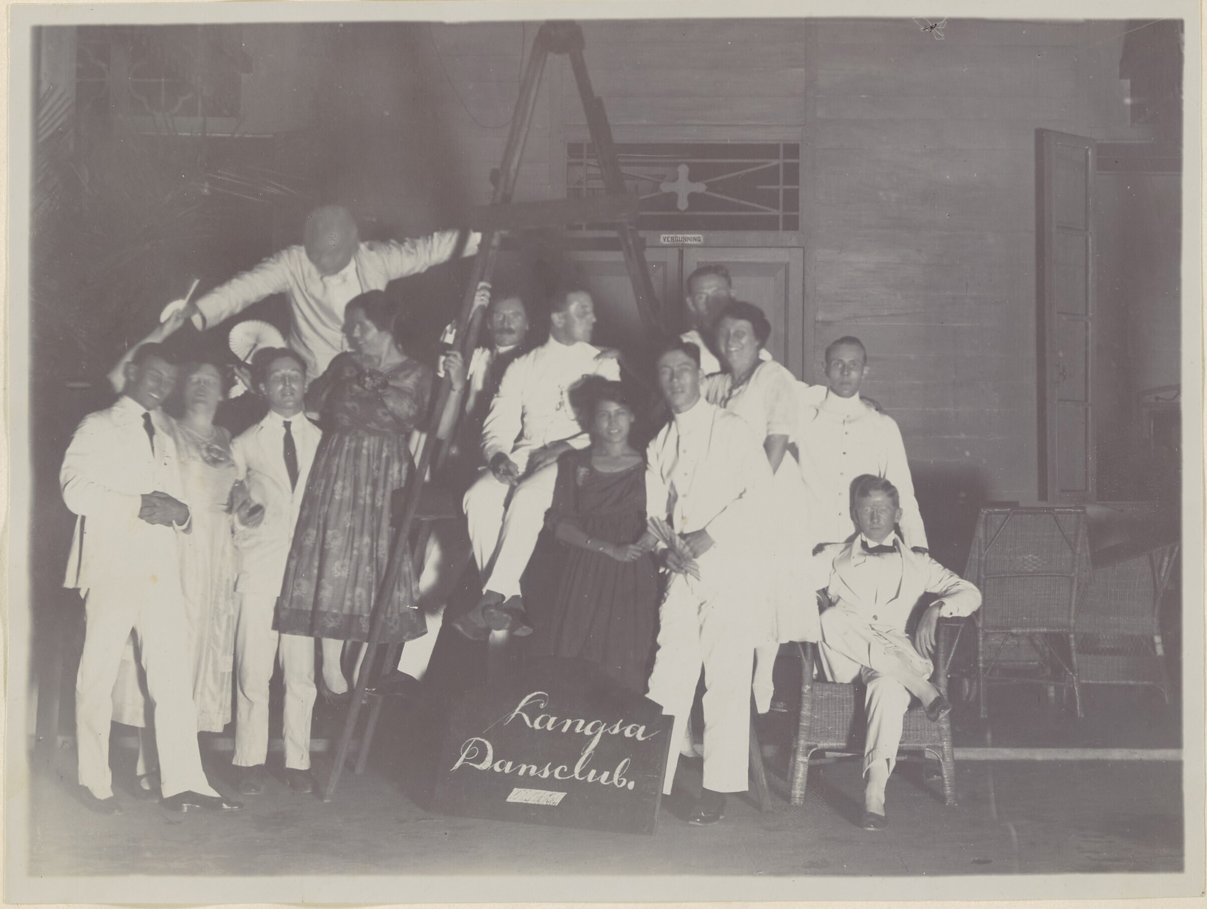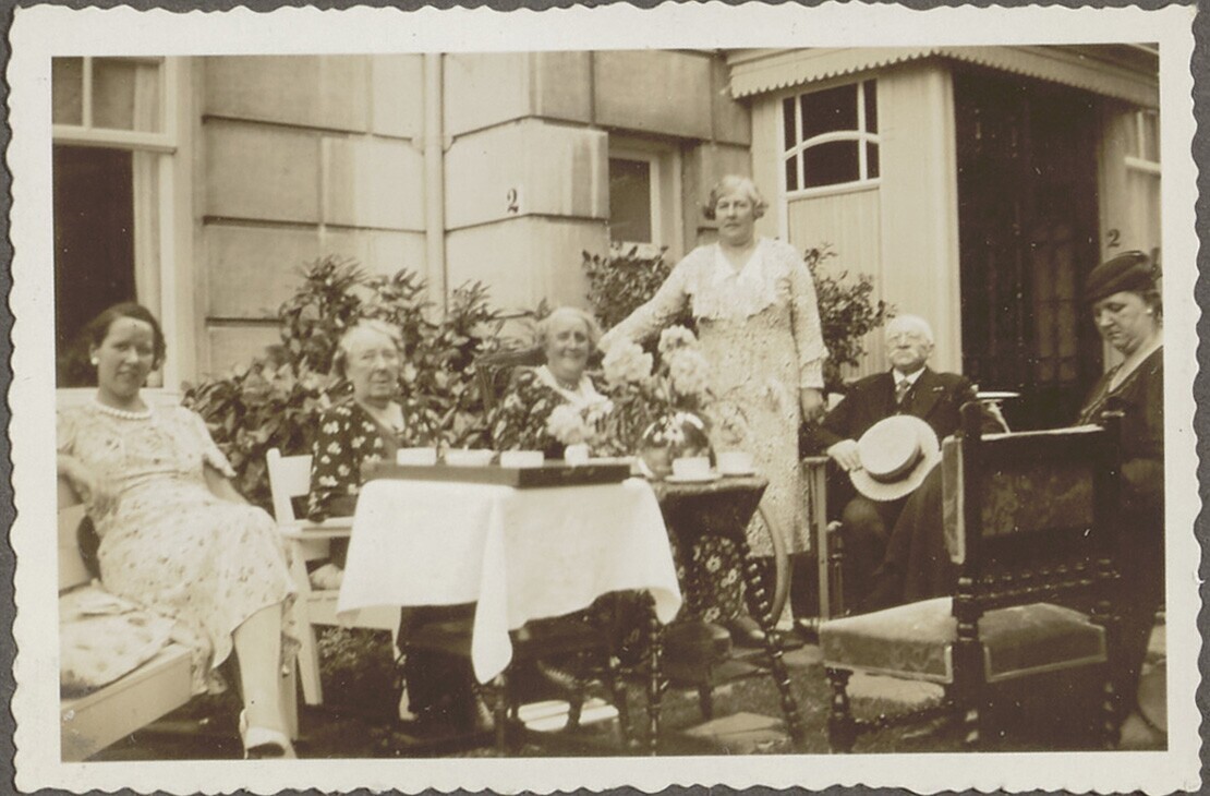 Groepsportret van mannen en vrouwen voor een gastenv...