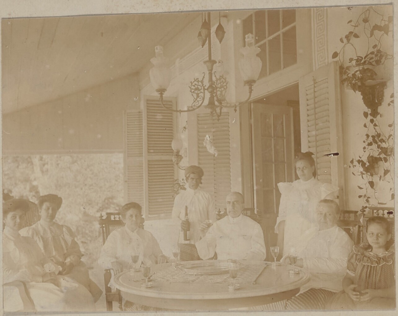 Portret van een familie op voorgalerij met een lid v...
