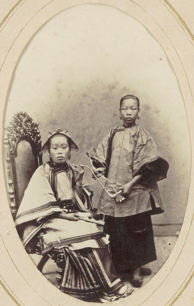 Portret van een Chinese vrouw met opiumpijp en een l...