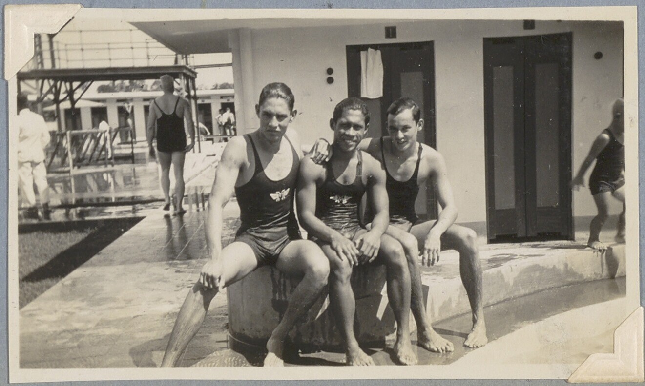 Groepsportret van polospelers op railing van een boot