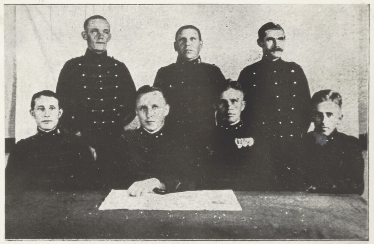 Portret van zes mannen voor een bord van de Koninkli...