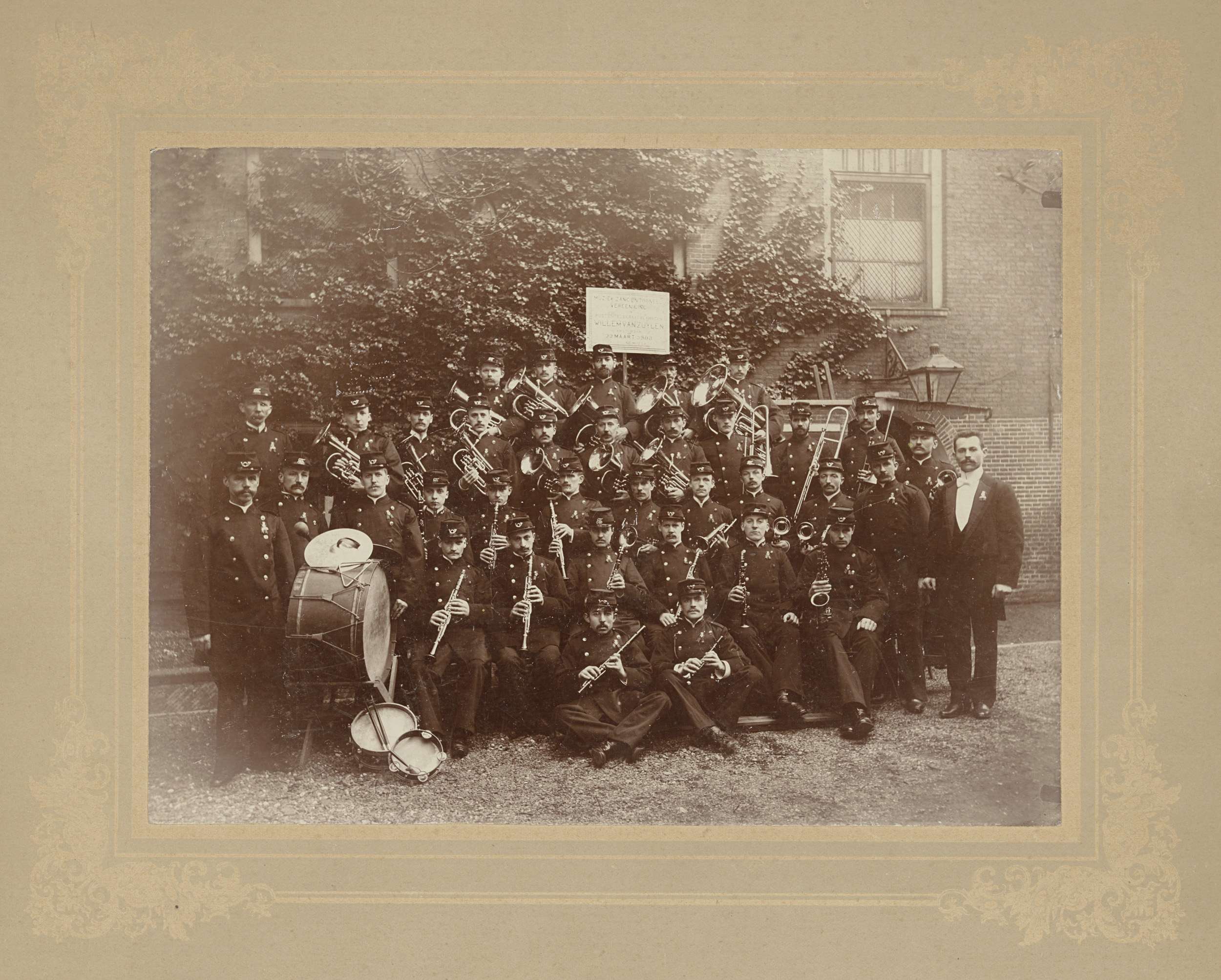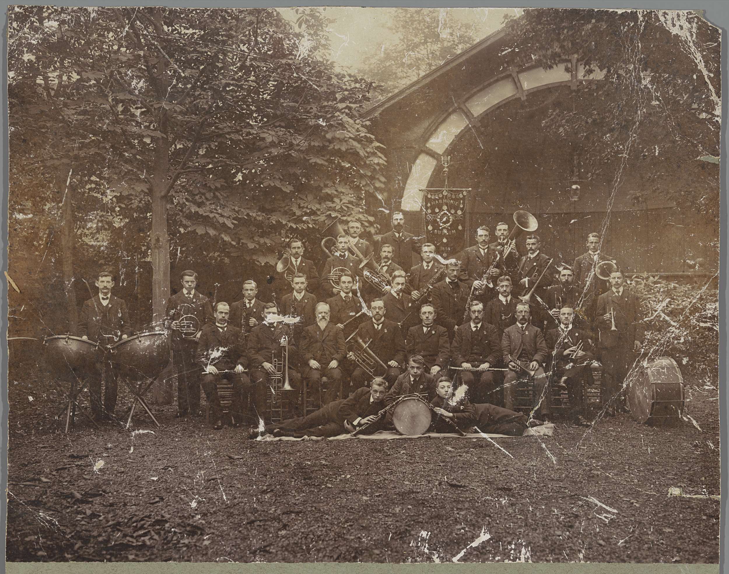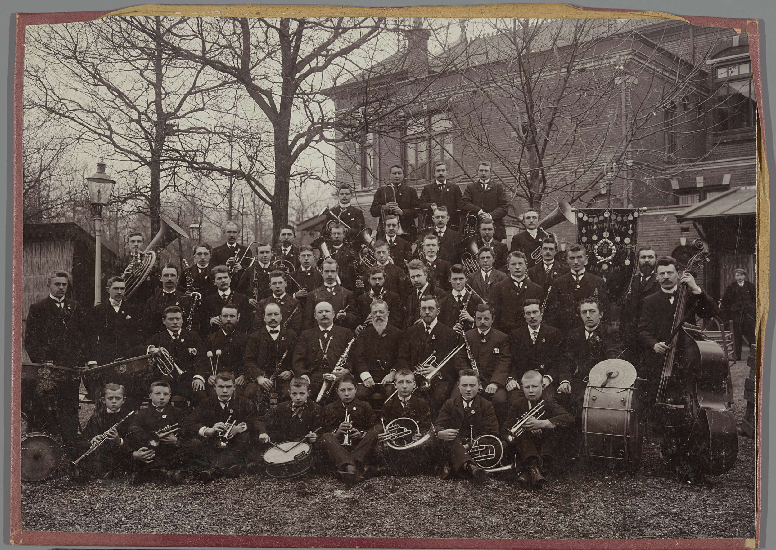 Groepsportret van muziekvereniging 'Kunst en strijd'...