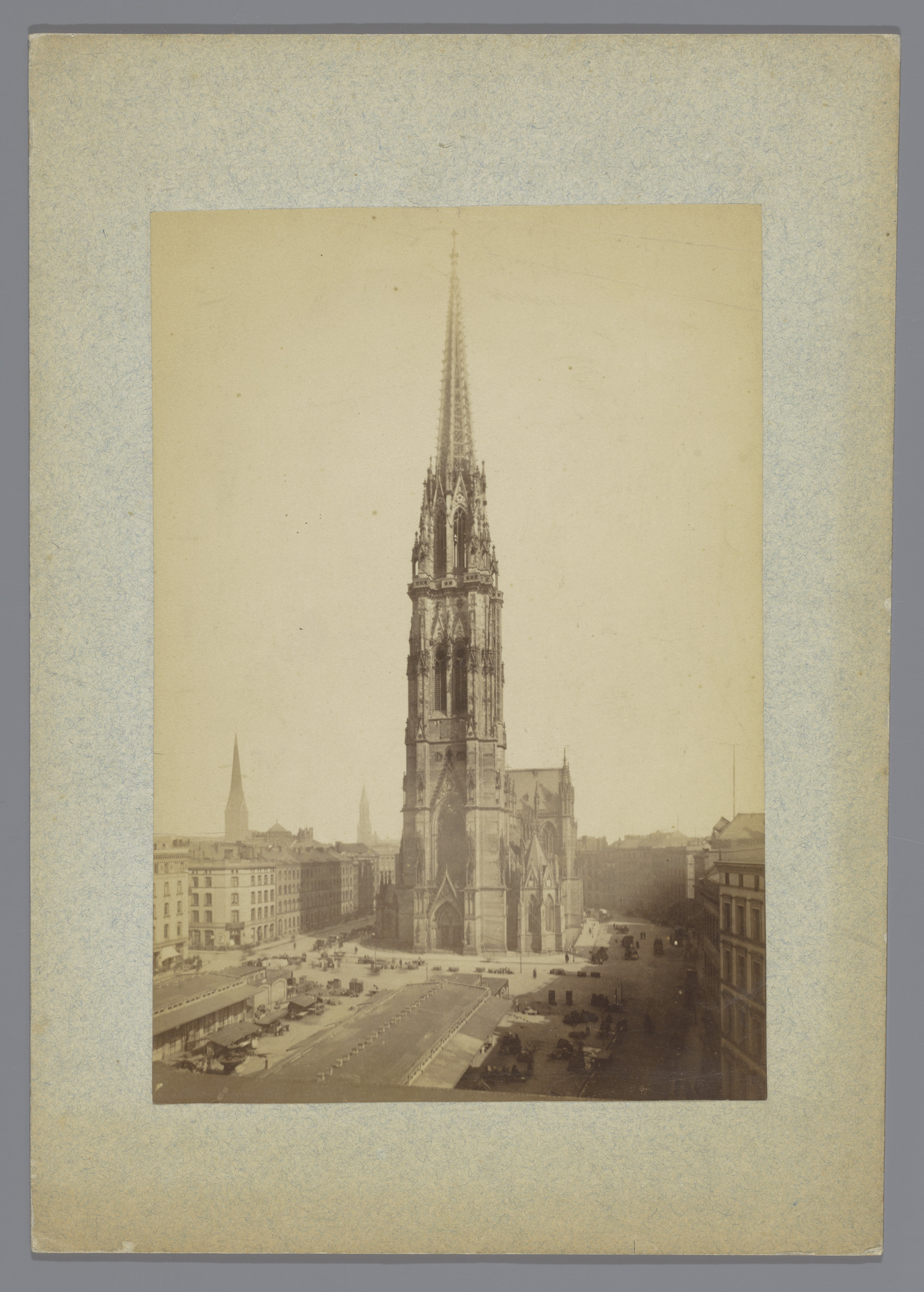 Gezicht op de Sankt Nikolaikirche te Hamburg, Duitsland