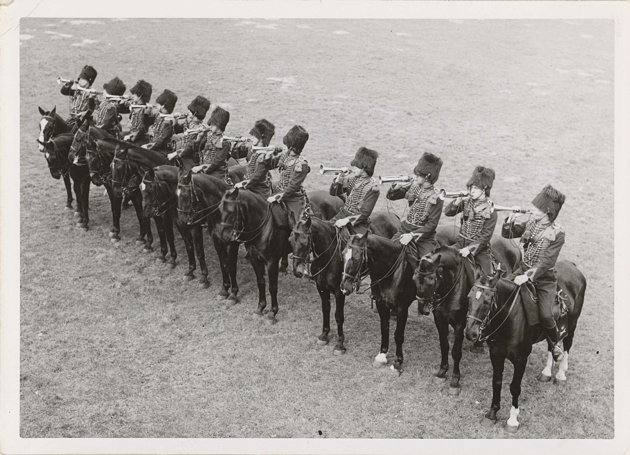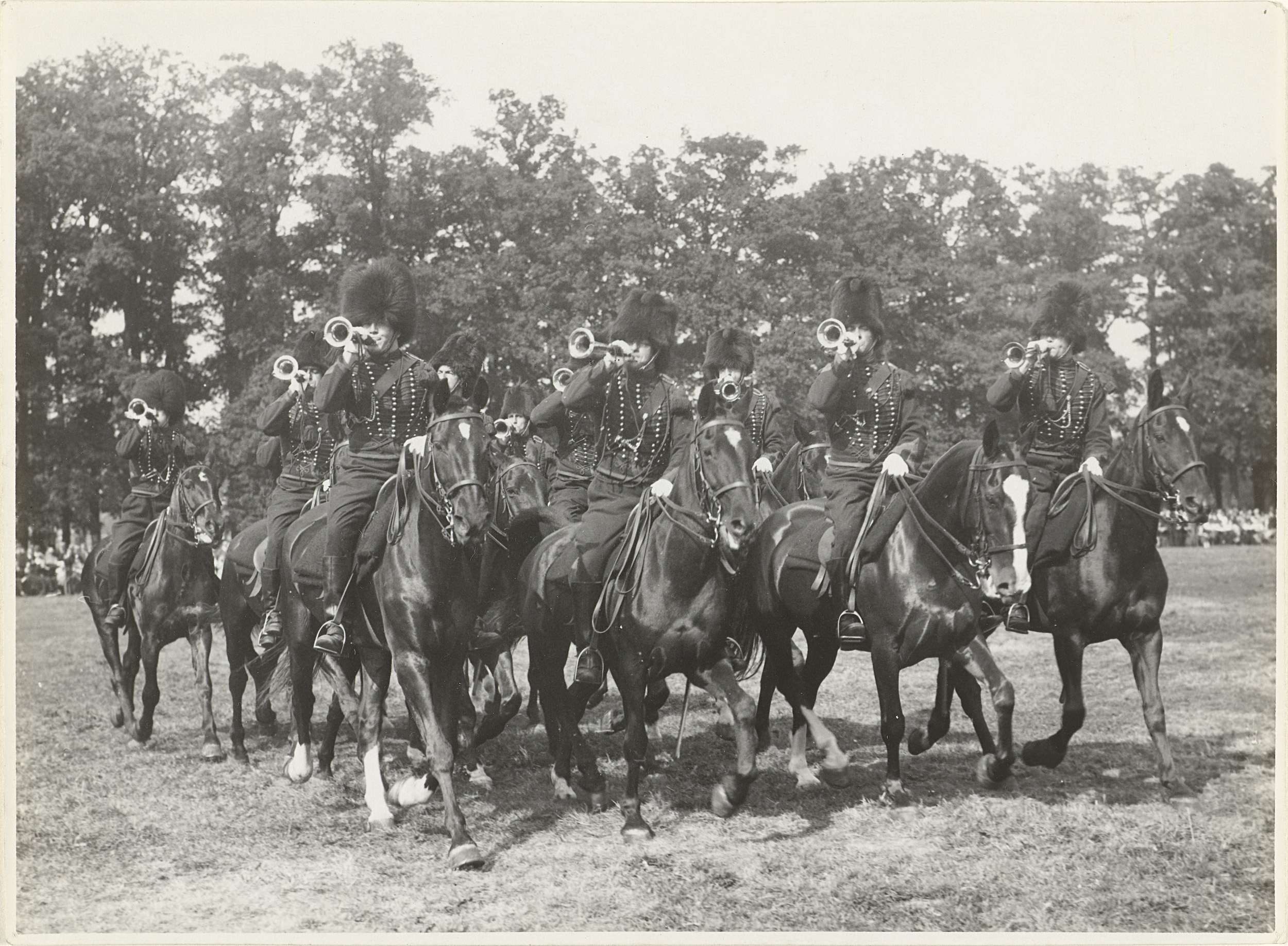 Ruiters van het Korps Rijdende Artillerie met trompe...