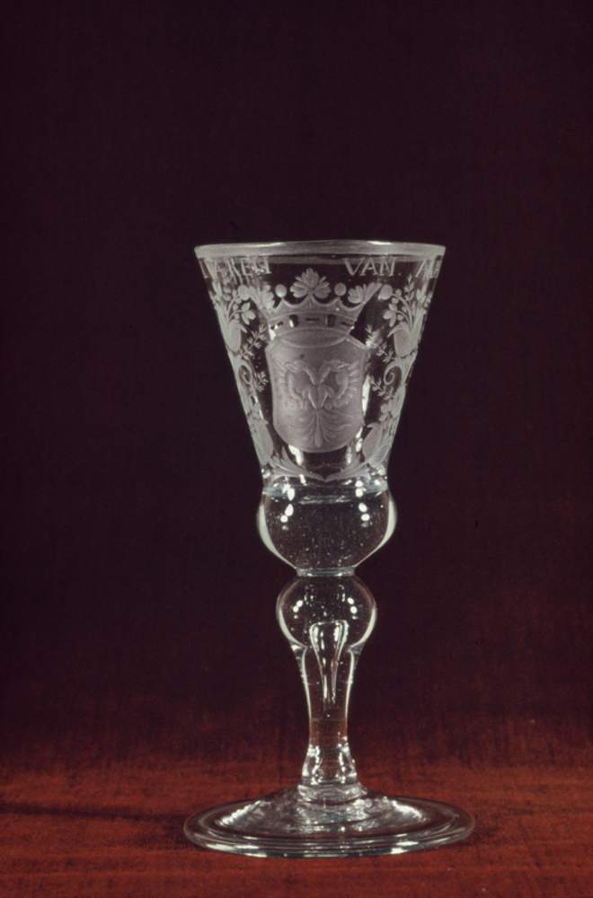 Kelkglas met tekst ‘HET WELVAREN VAN ARAHEM’