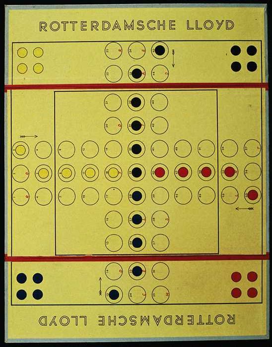 Spel mens-erger-je-niet: geel spelbord met langs bei...