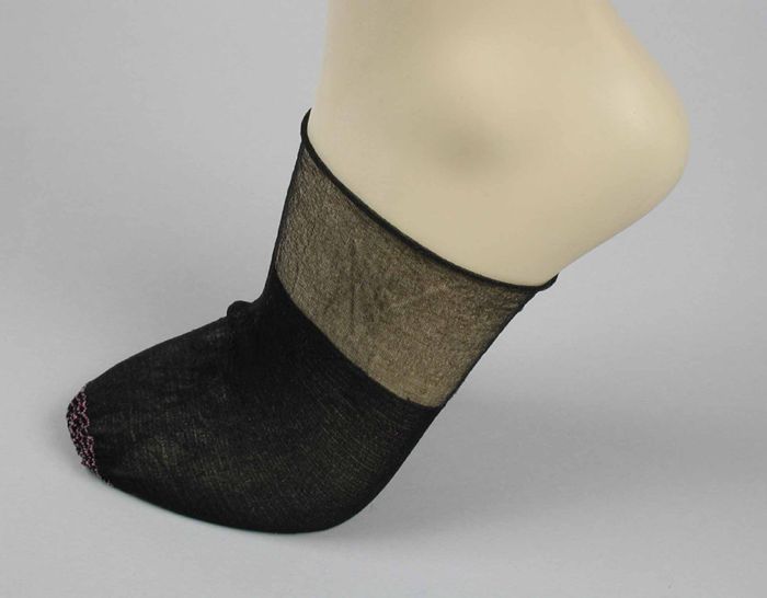 Eén kousenvoetje van zwart nylon, alleen de teen bed...