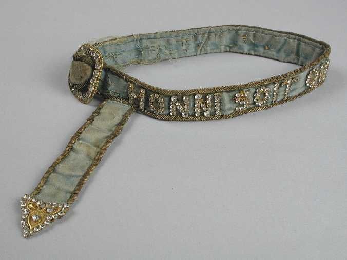 Kousenband van turkoois fluweel met "HONNI SOIT QUI ...