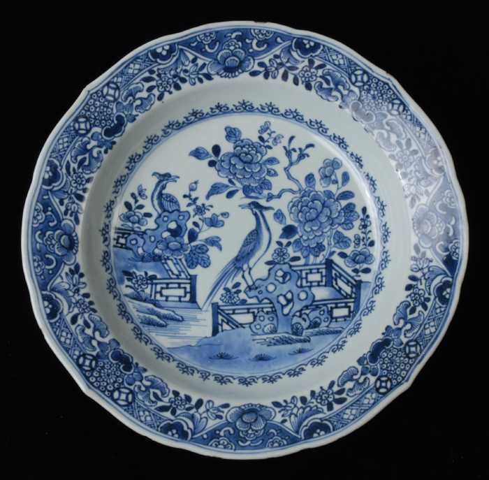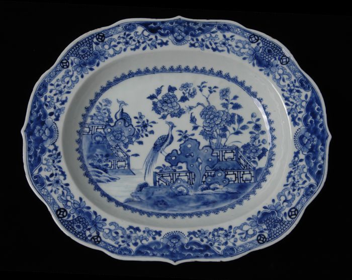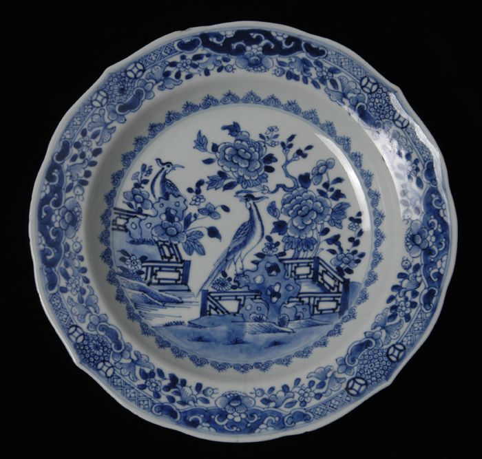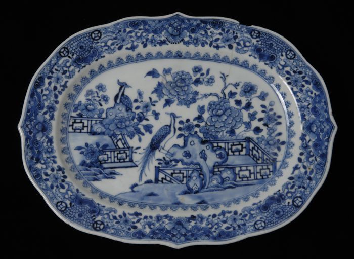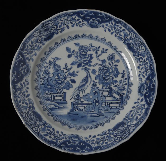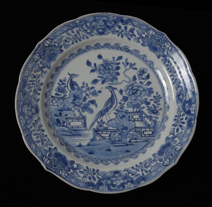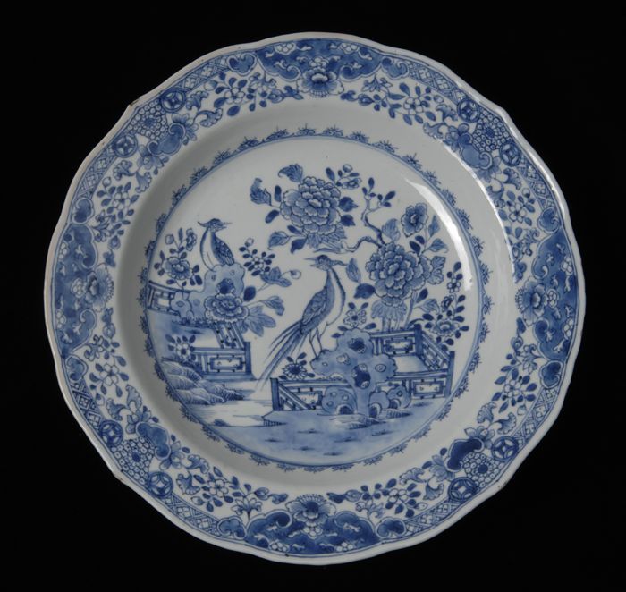 Witte schotel met in blauw op plat twee fazanten, ba...