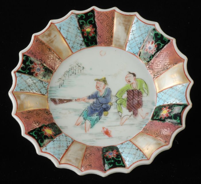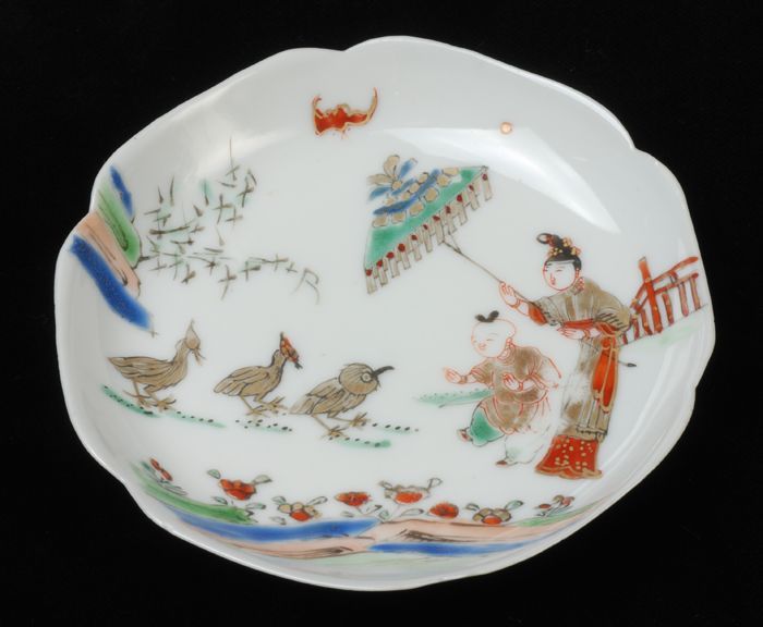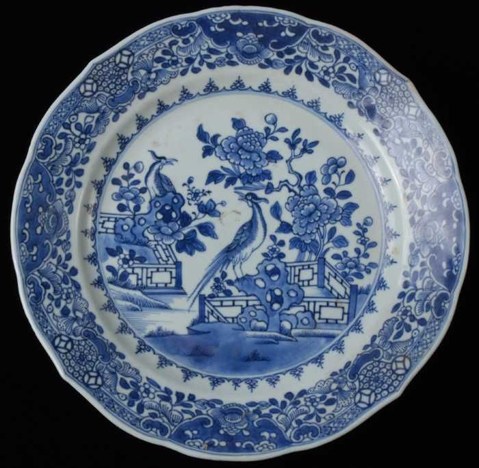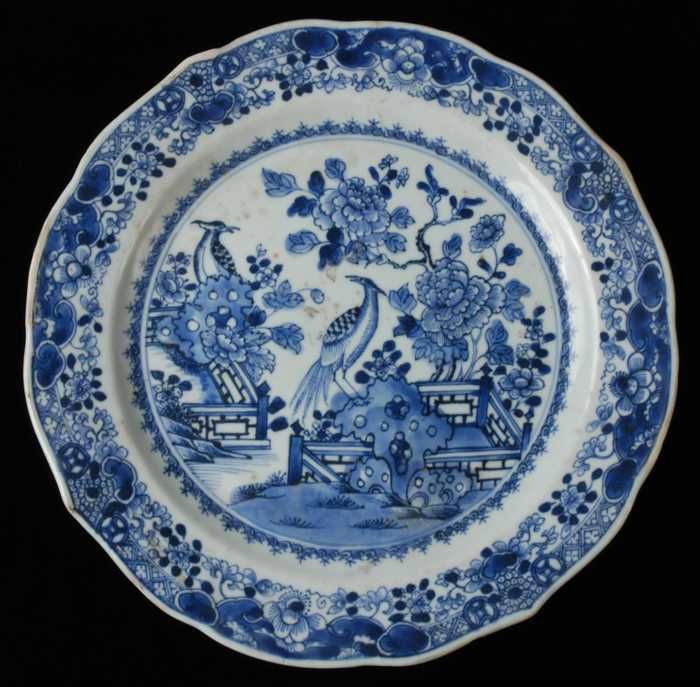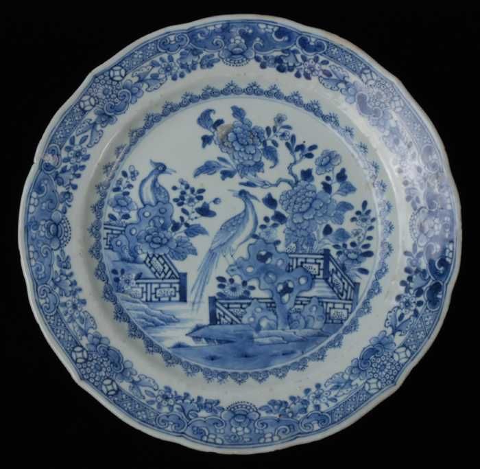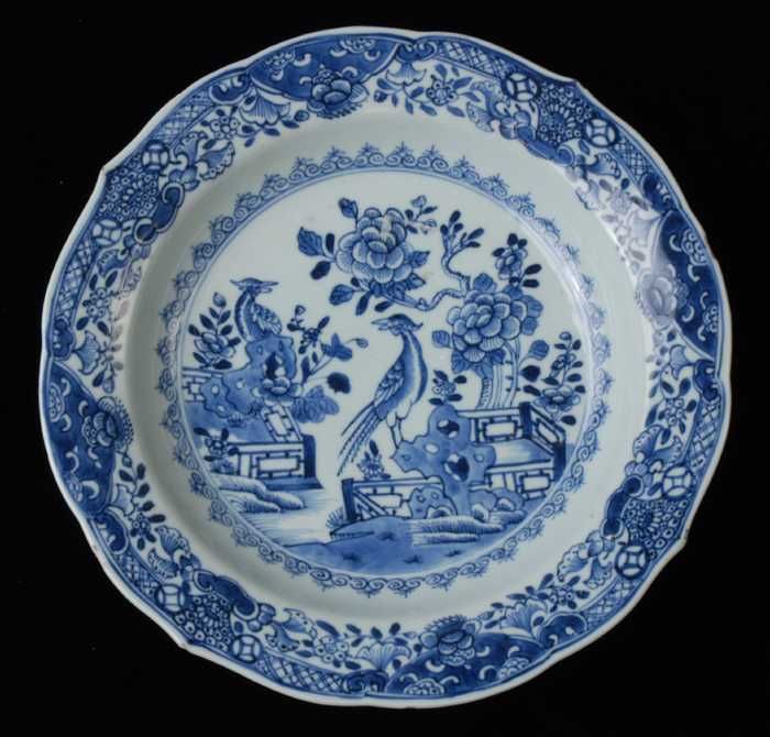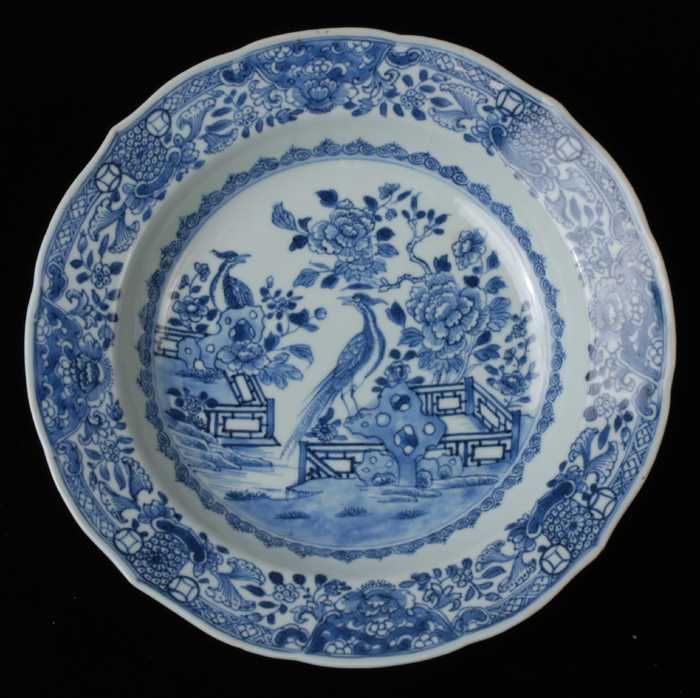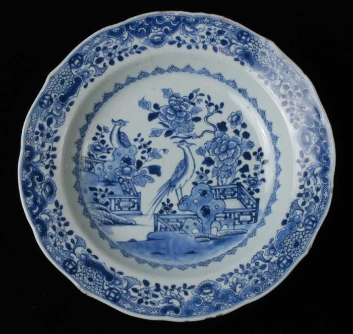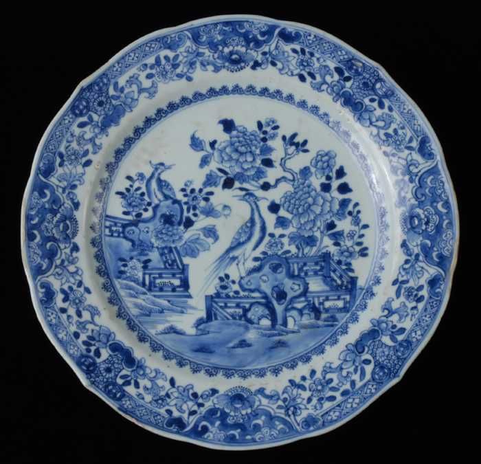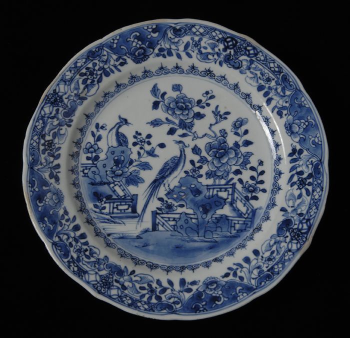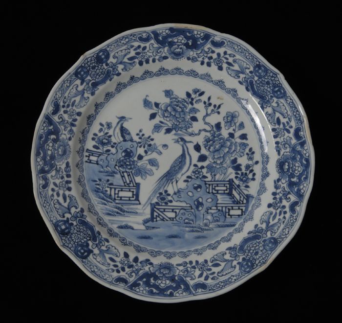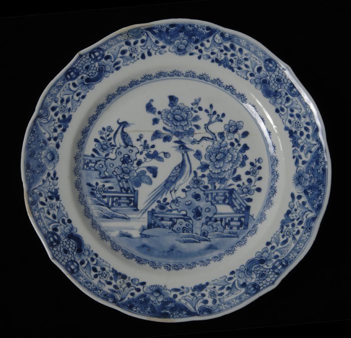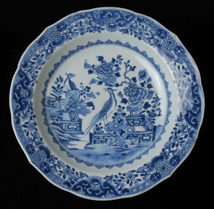 Plat rond bord met op plat twee fazanten, pioenstrui...