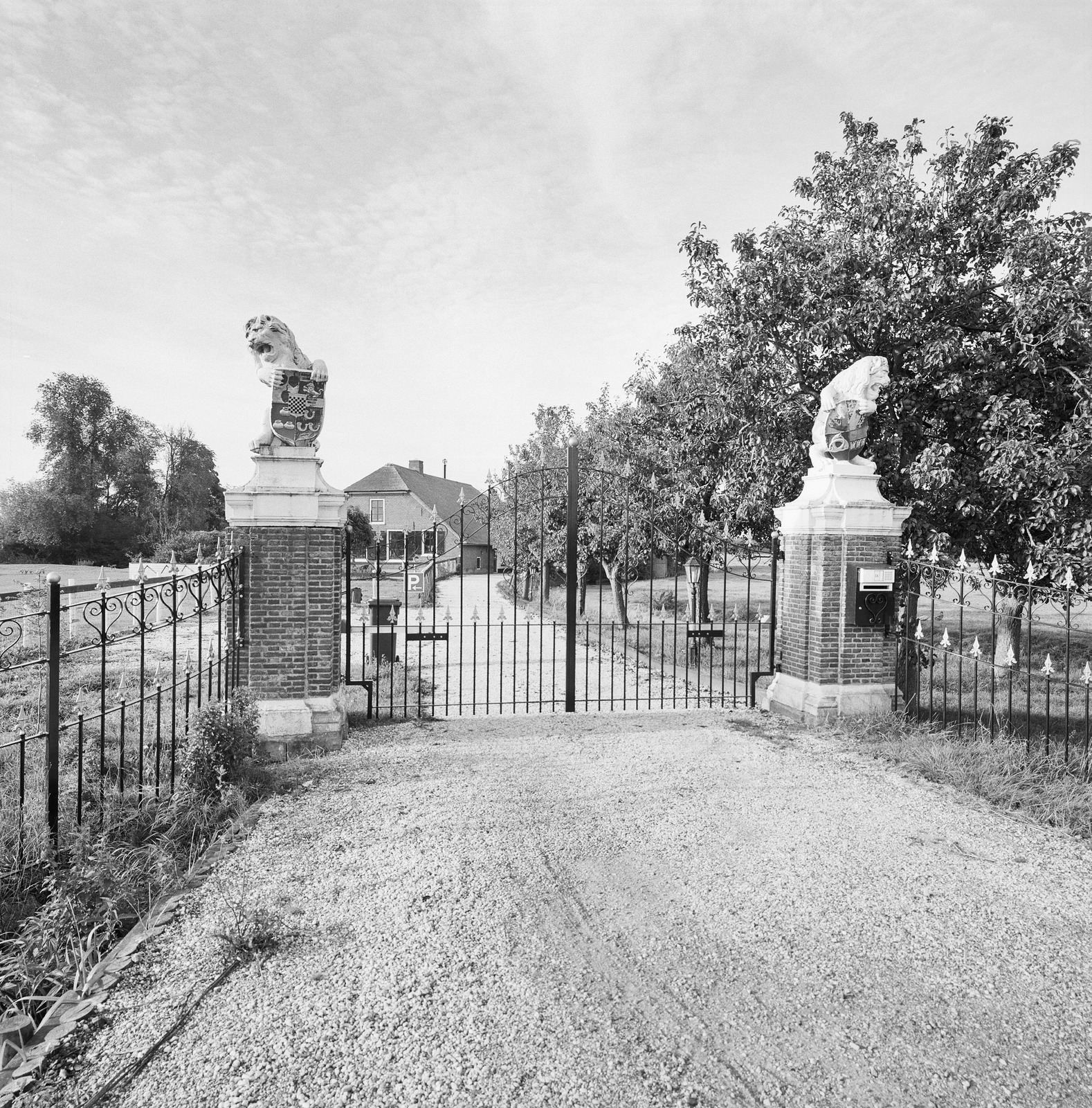 Overzicht, toegangshek met stenen hekpijlers
