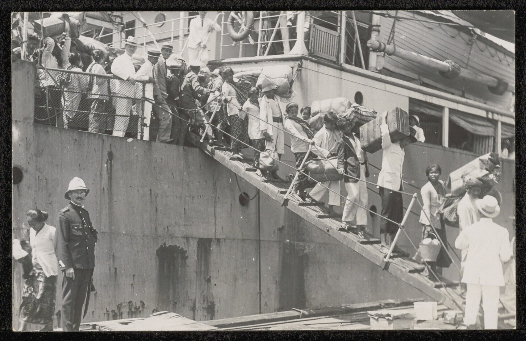Javaanse immigranten op de loopplank van het passagi...