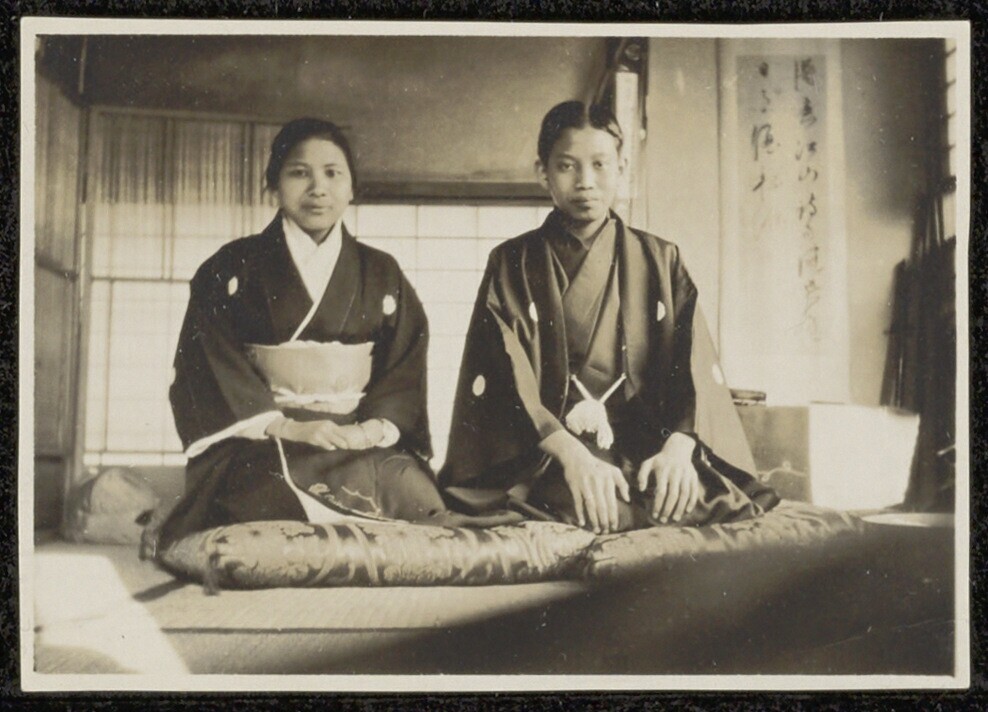 Roekmita en Pandoe Soeradhiningrat in het huis van M...