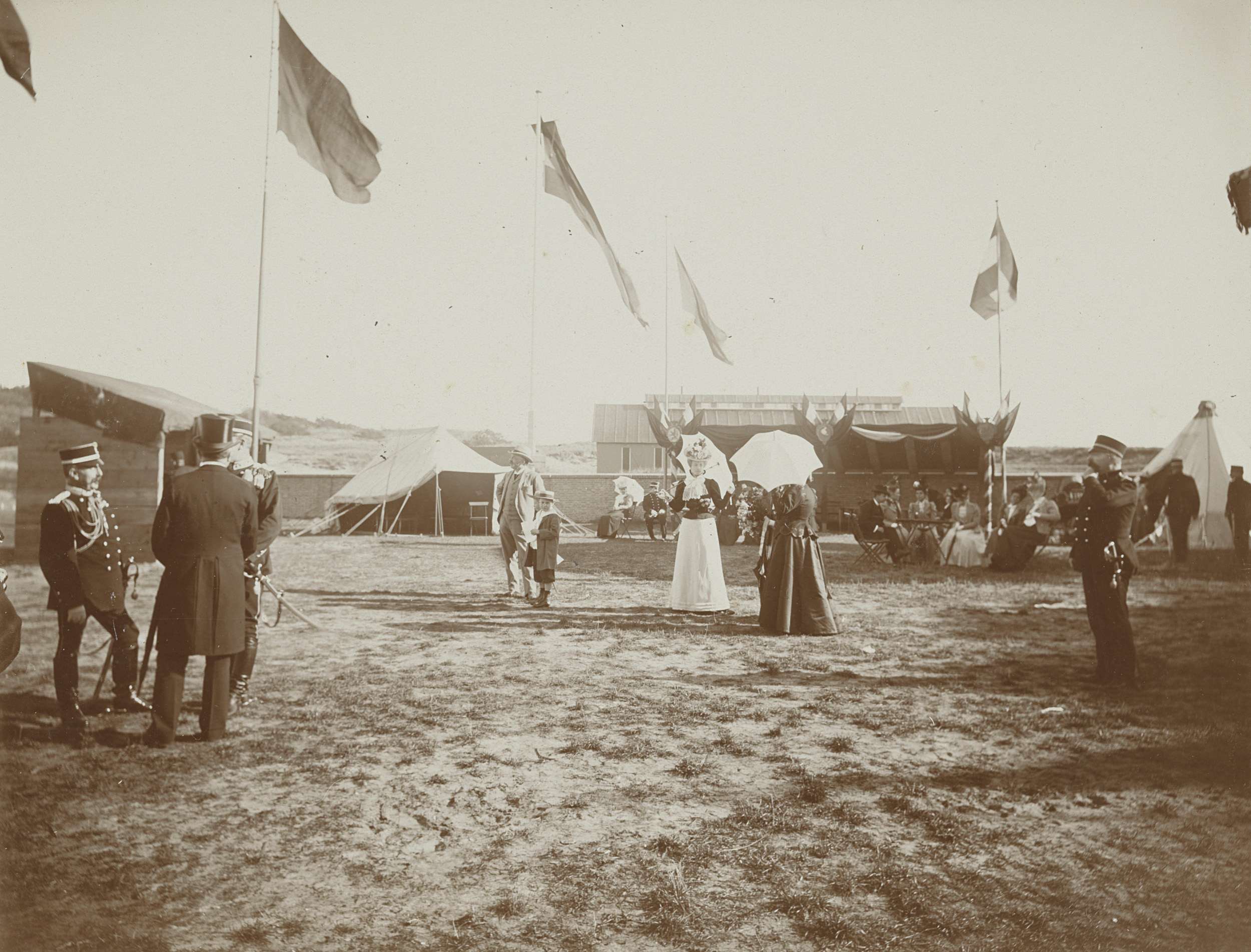 Koningin Wilhelmina en koninginmoeder Emma in feesttent