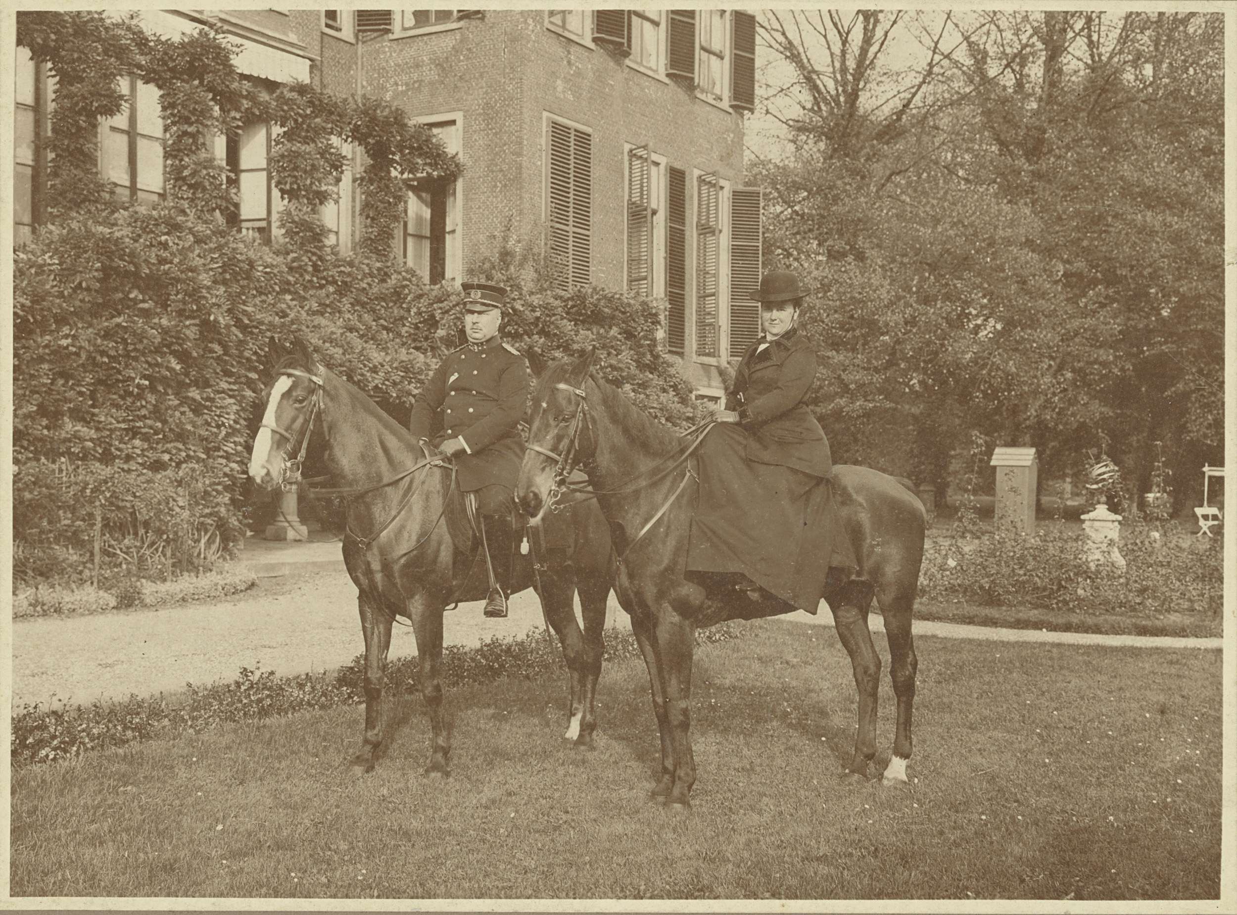 Koningin Wilhelmina en prins Hendrik te paard in park