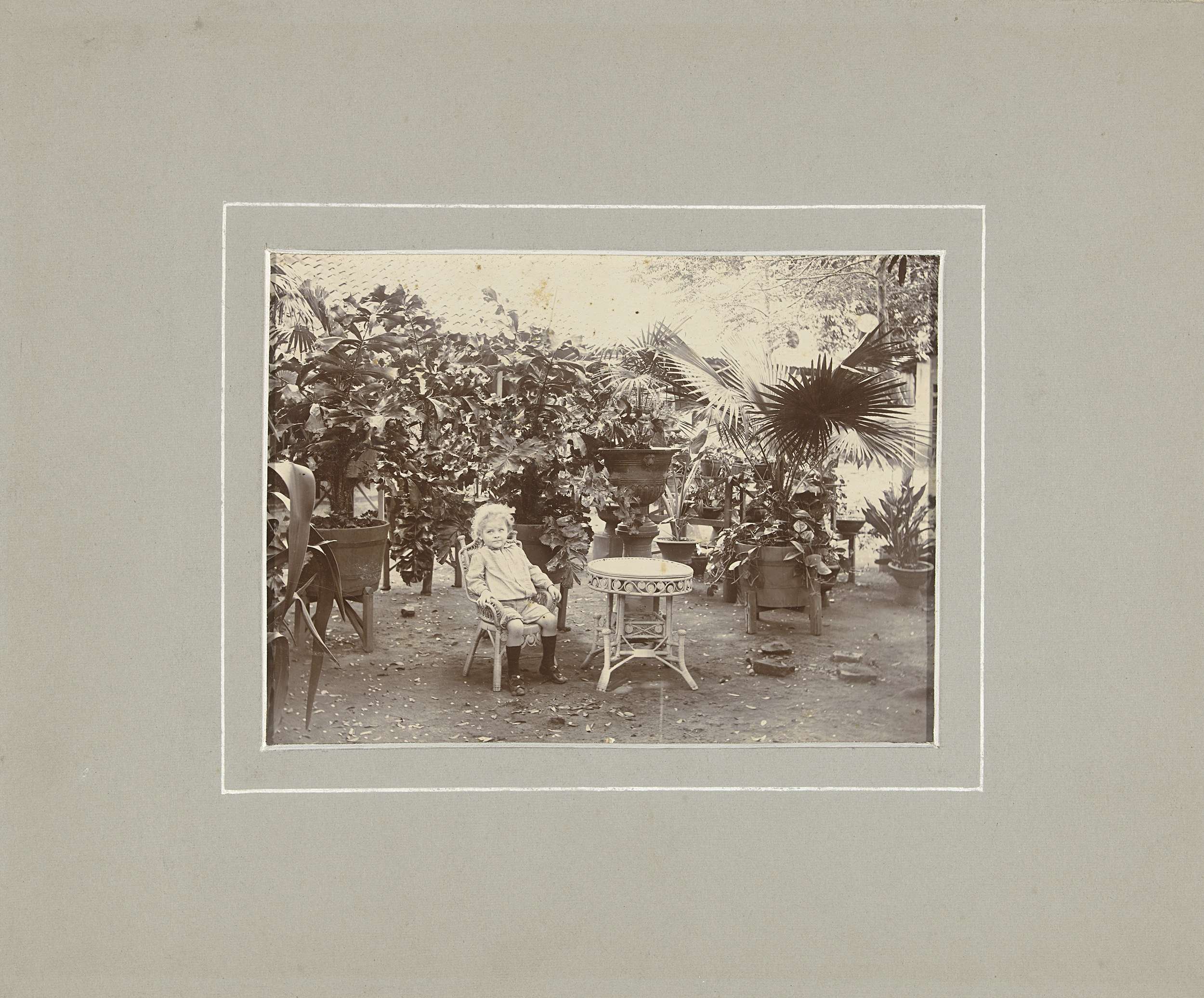 Portret van een onbekend kind op een stoel tussen pl...