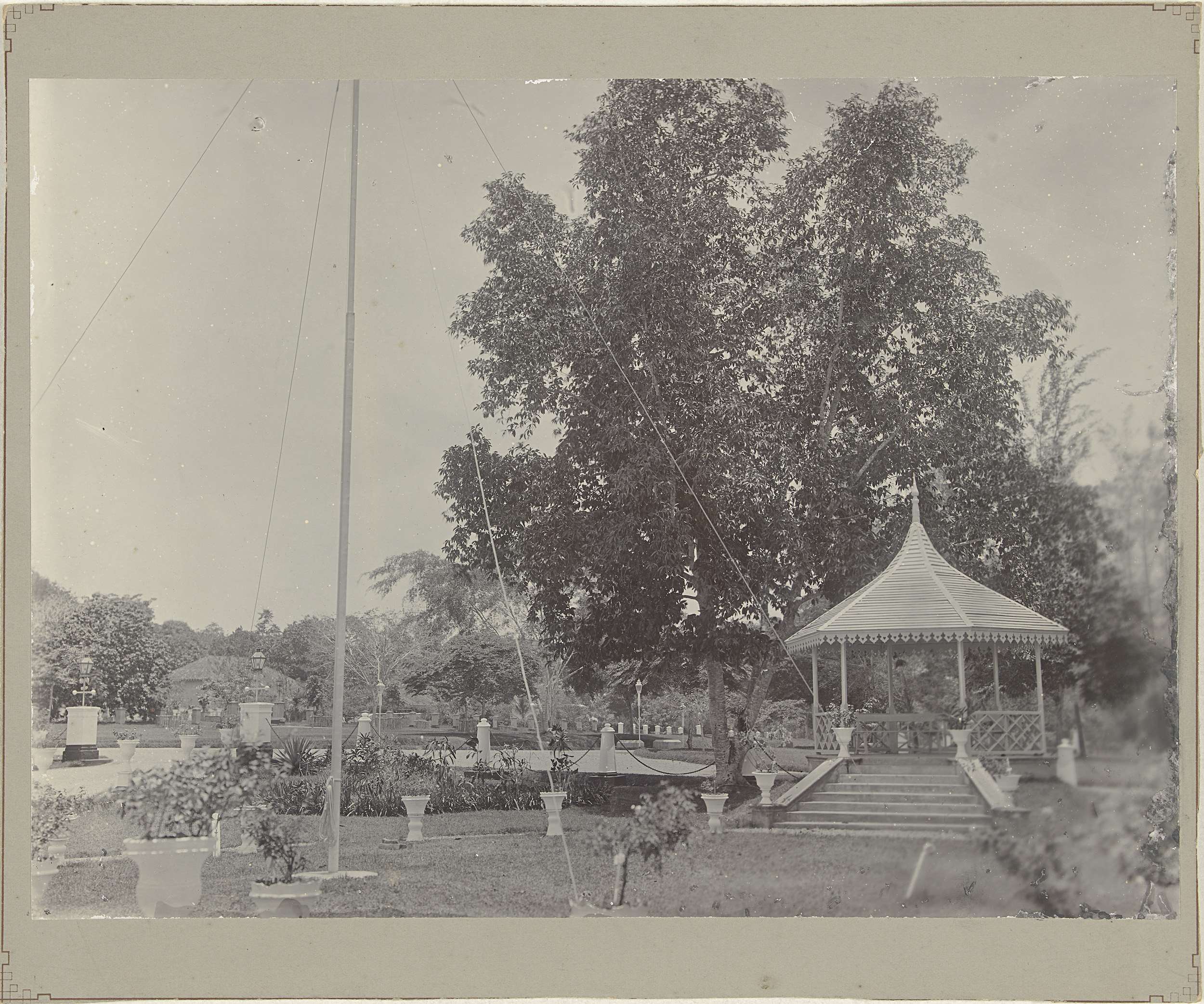 Tuin met vlaggenmast en pendopo in Nederlands-Indië