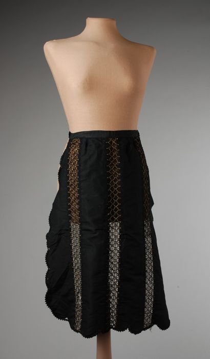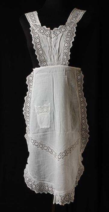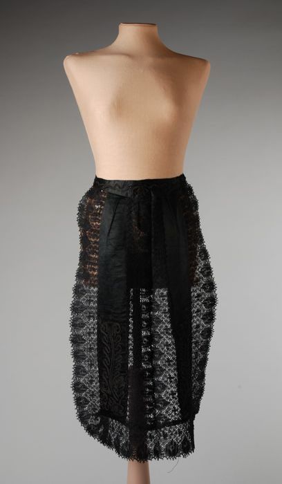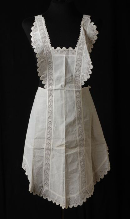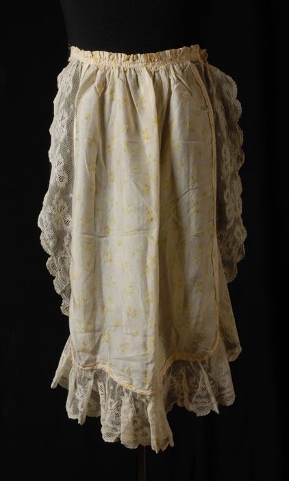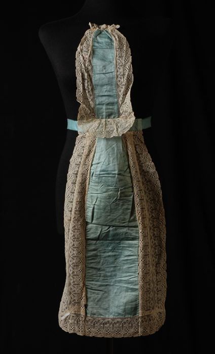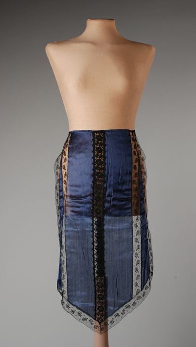 Donkerblauw glanzend schort afgebiesd met zwart kant