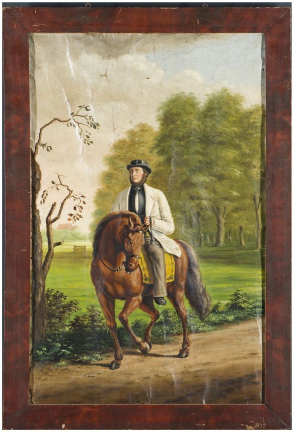 Portret van T.S. Klaversma te paard in boomlandschap