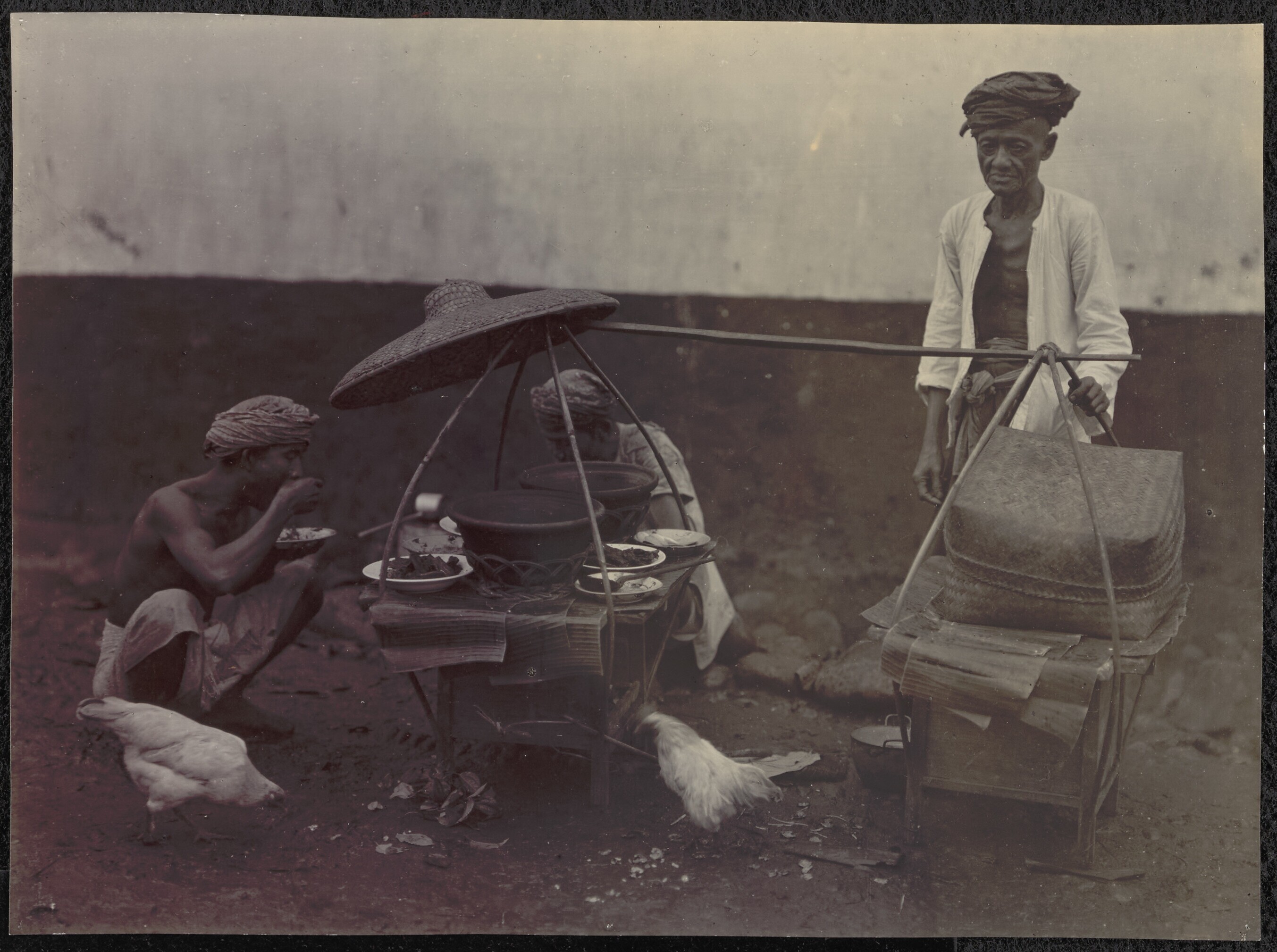 Javaanse verkopers met drank en etenswaren langs de ...