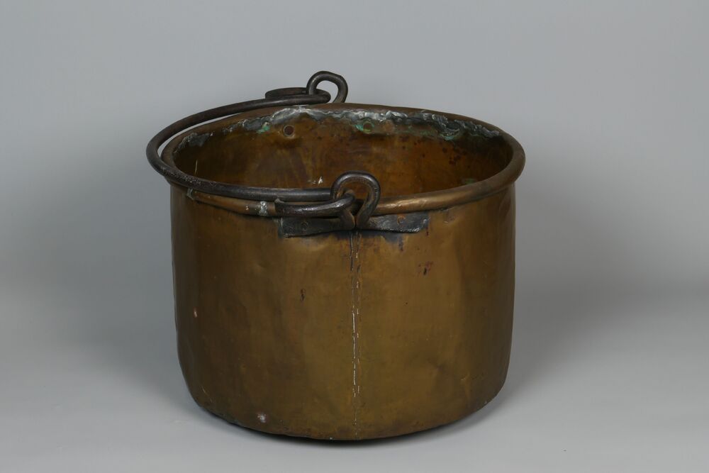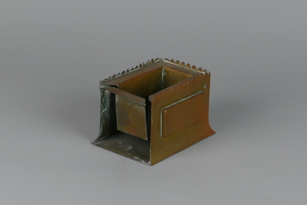 houtbak van geel koper, met ijzeren hengsel.