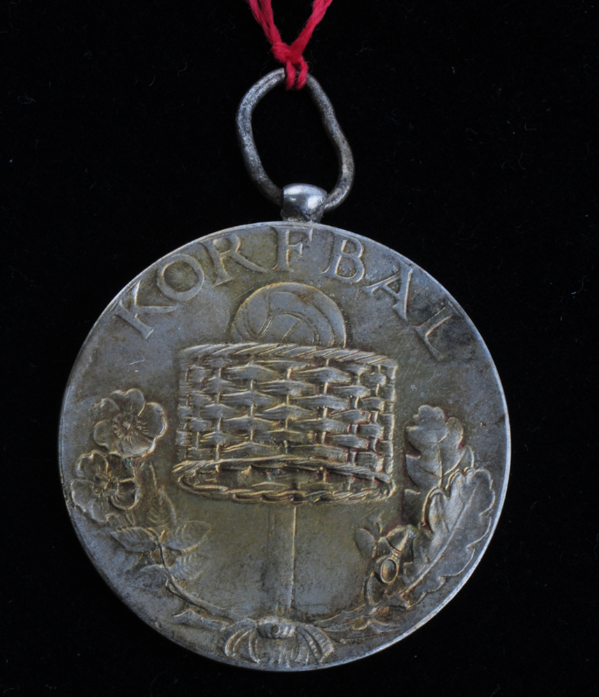 Medaille van metaal voorstellende een korfbalmand 1925