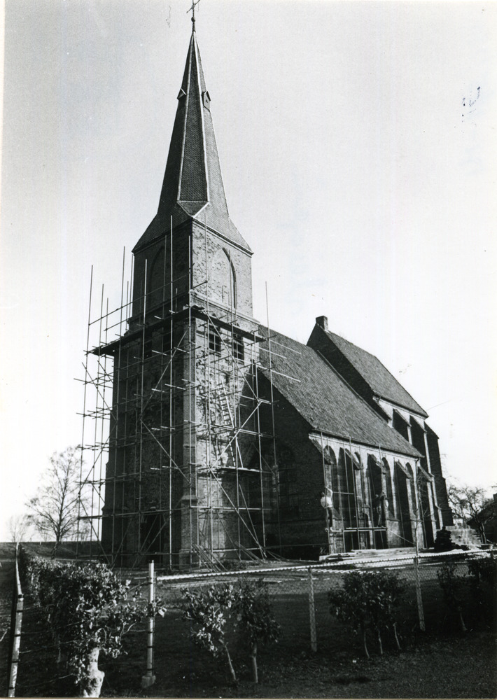 Zwart-wit foto van de kerk in de steigers in Aerdt d...