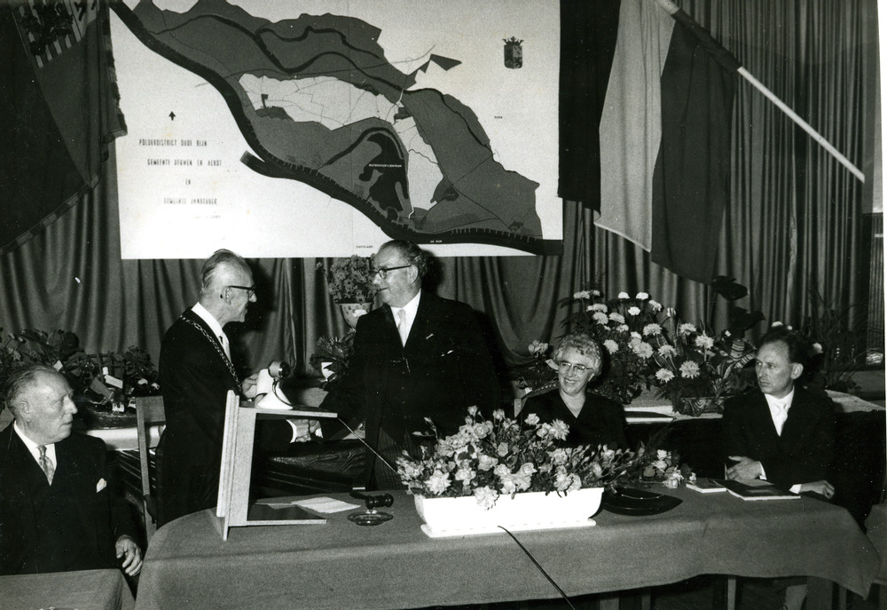 Zwart-wit foto van het afscheid van gemeentesecretar...