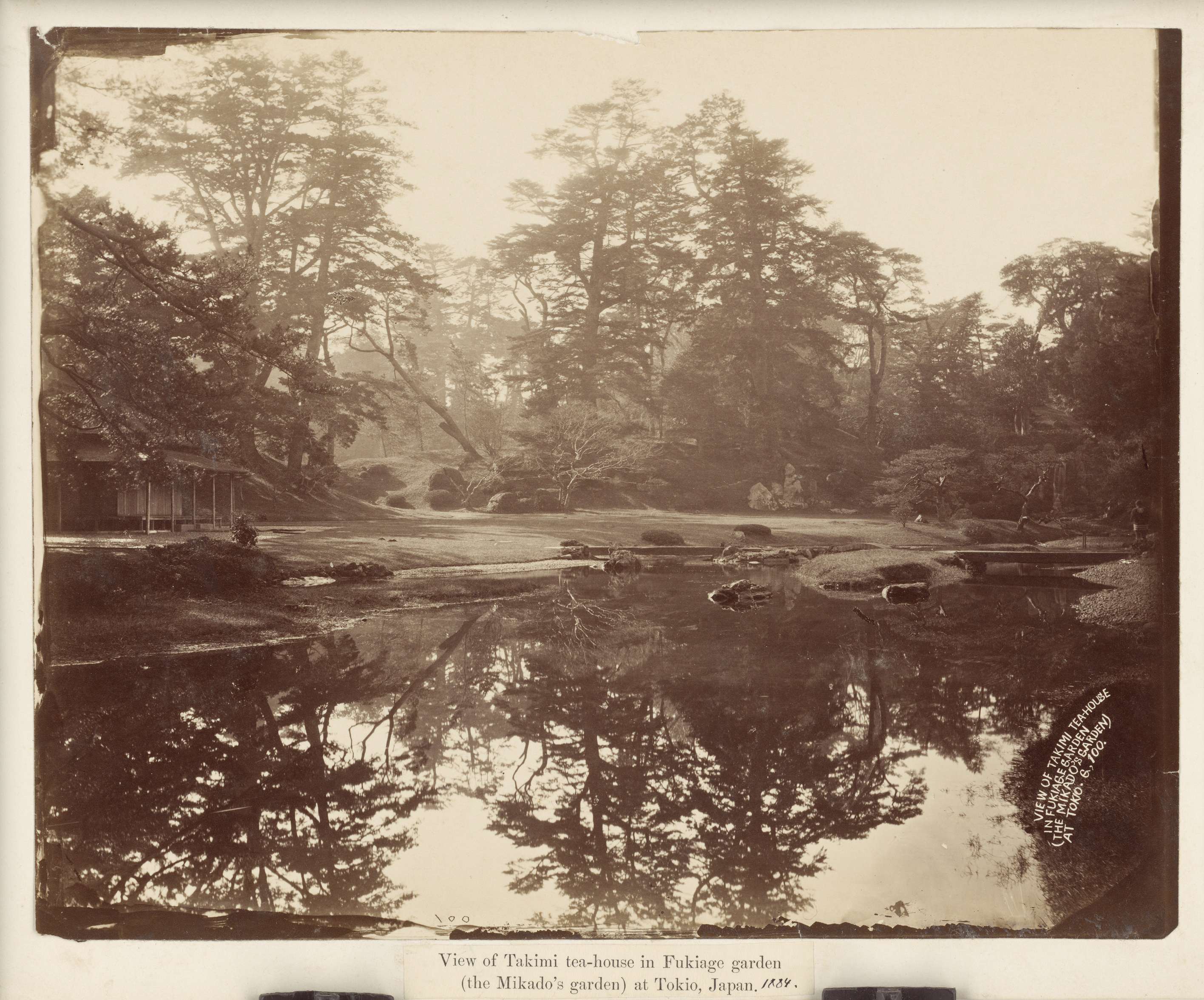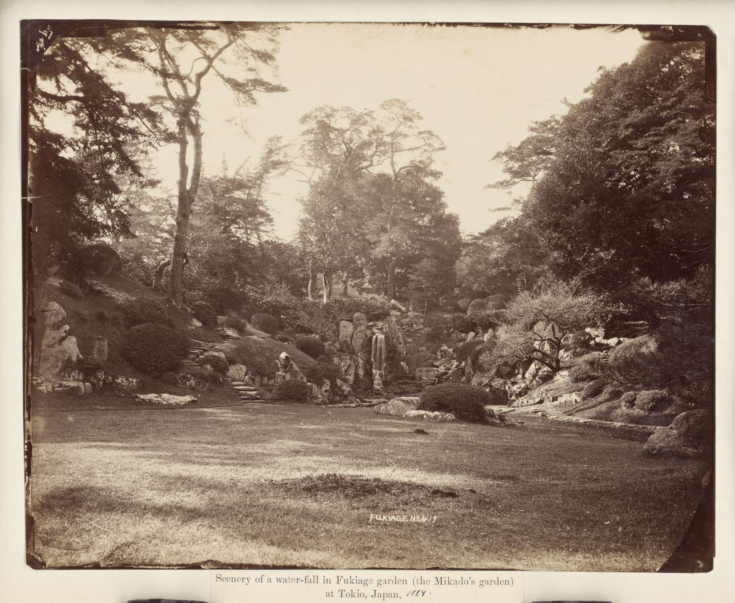 Gezicht op een waterval in de Fukiagetuin in Tokyo