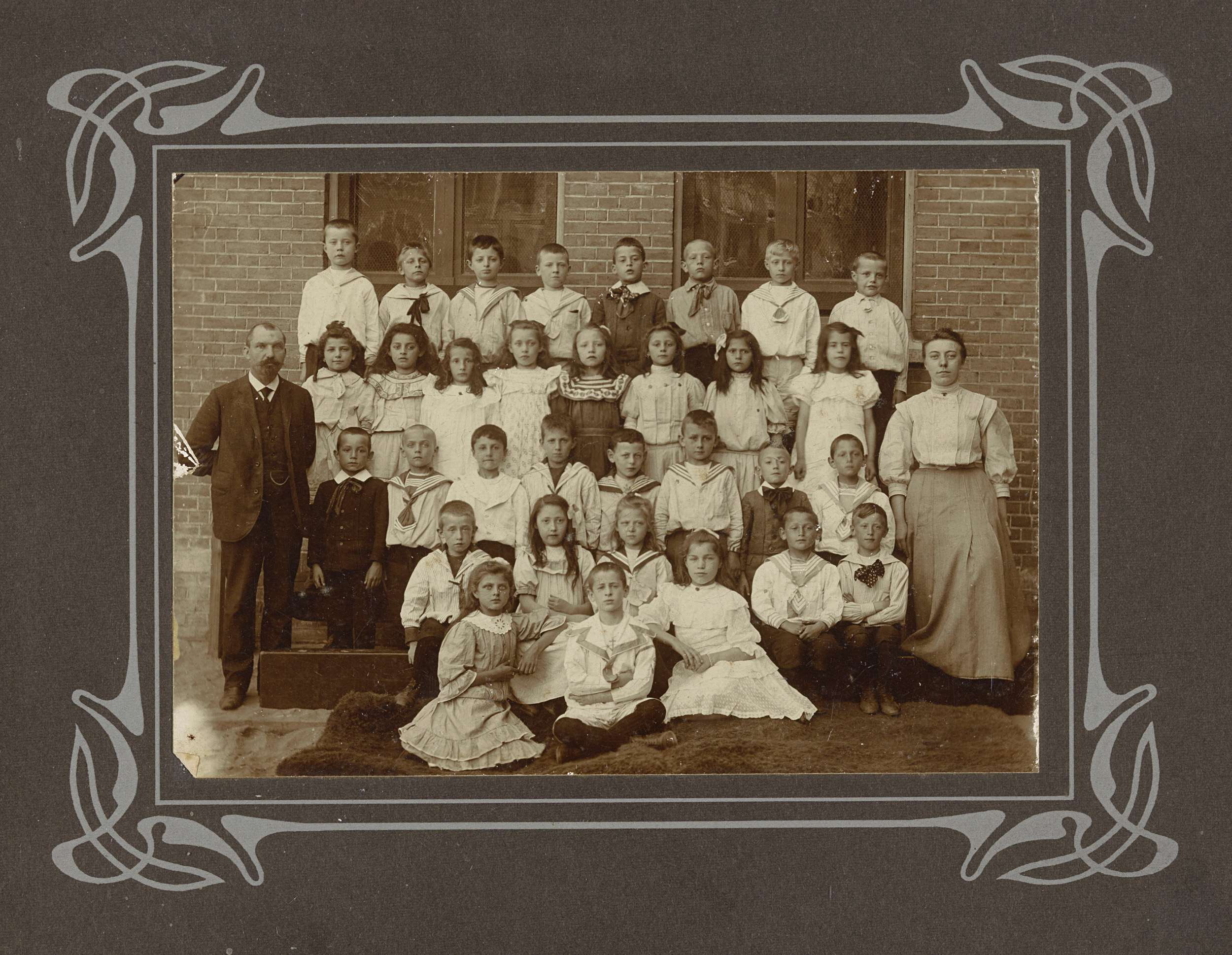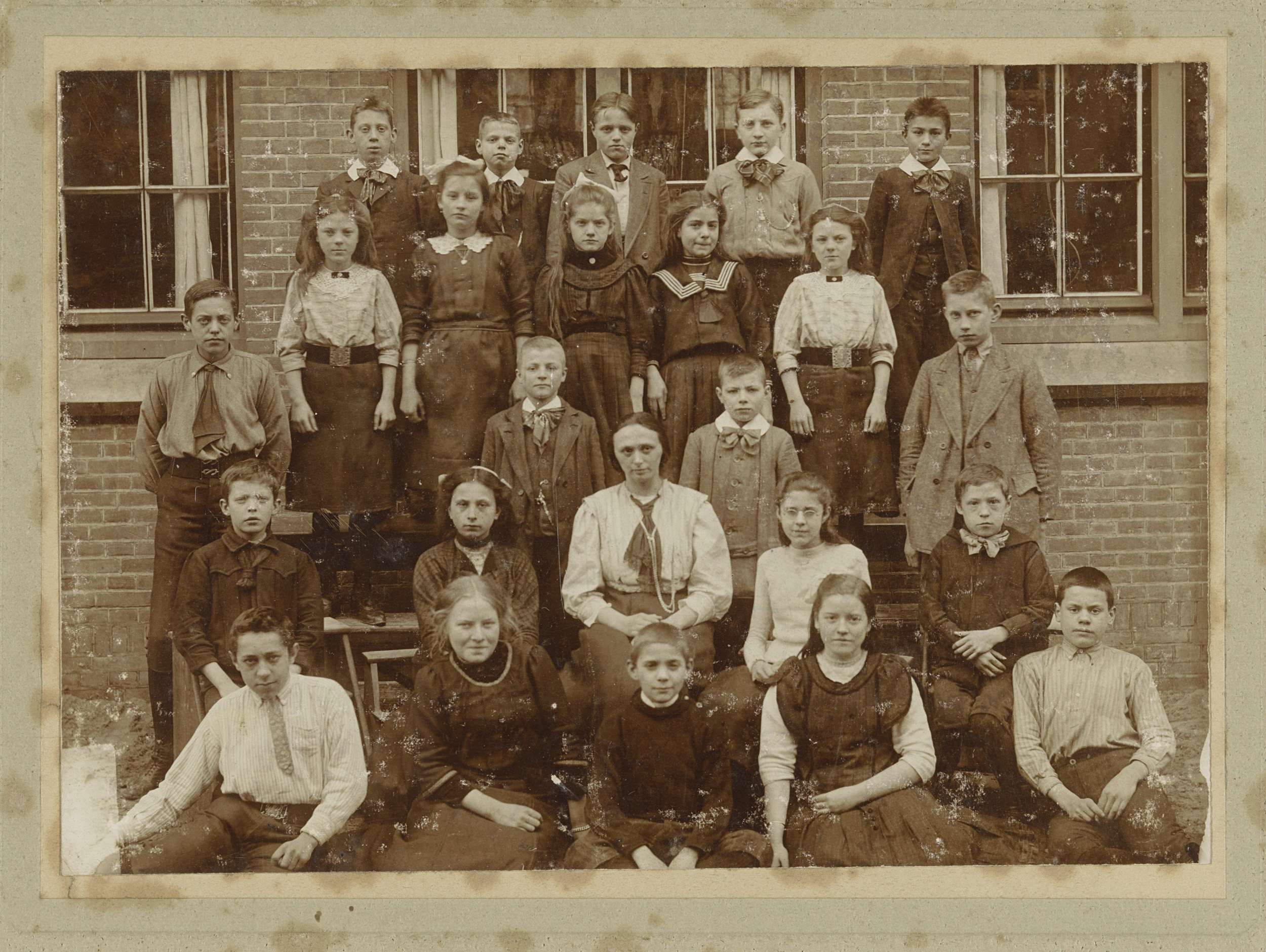 Groepsportret (klassefoto) van kinderen uit klas 8, ...