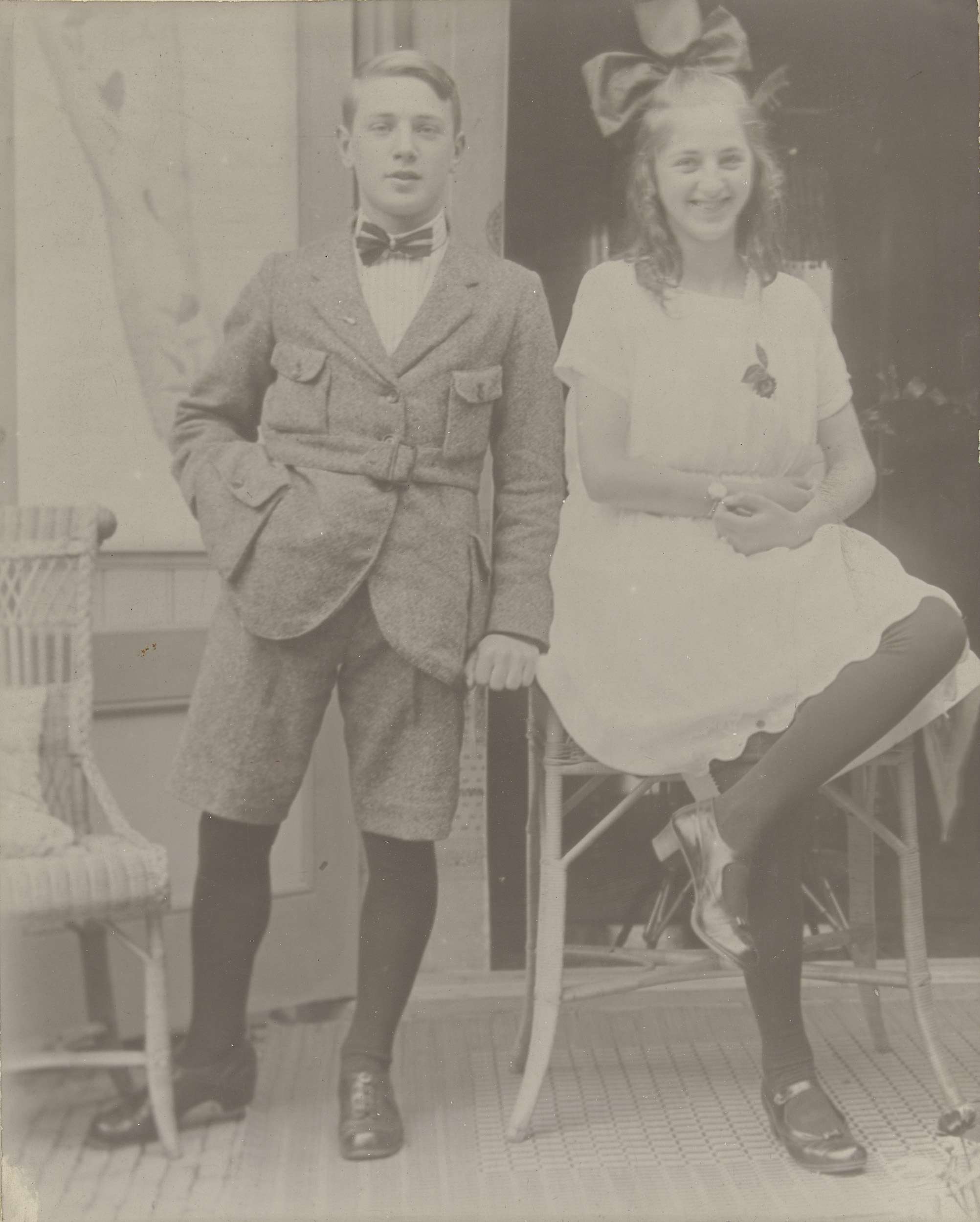 Groepsportret van jonge mannen en vrouwen voor een muur