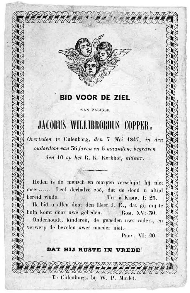 bidprent voor Jacobus Willibrordus Copper. Geboren 1...