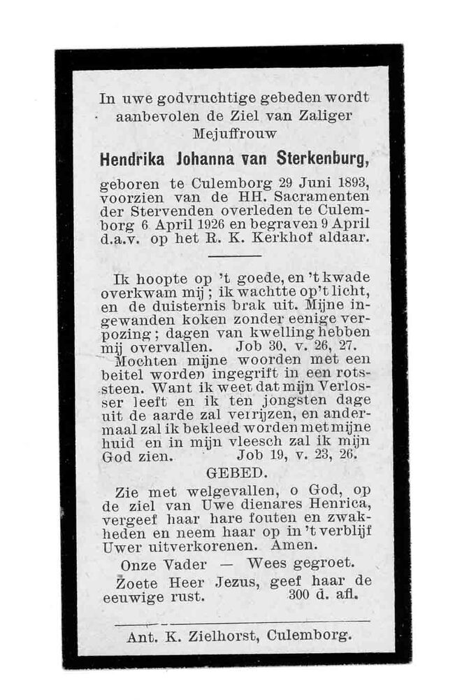 bidprent voor Hendrika Johanna van Sterkenburg. Gebo...