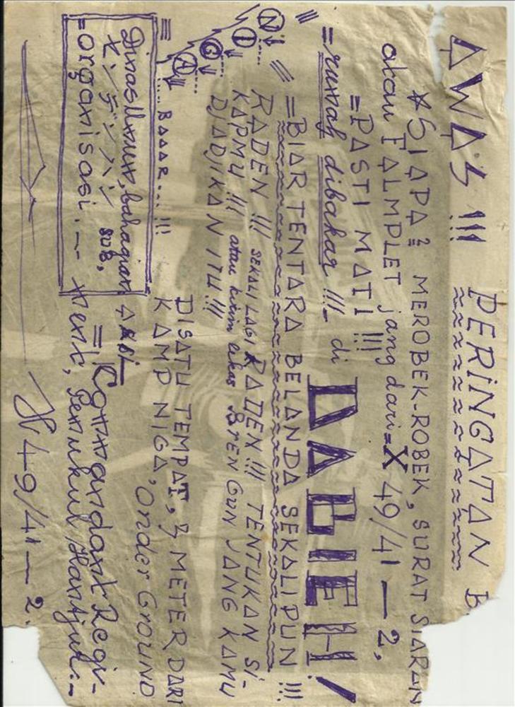 half affiche pro-Indonesië, woorden en tekening in h...