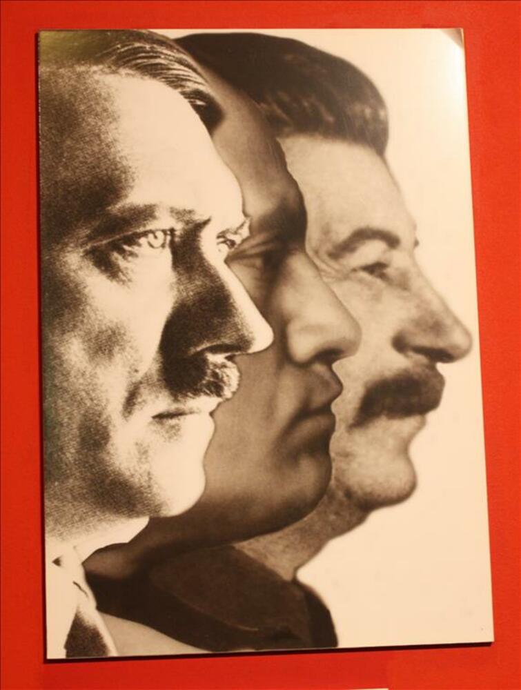 Hoofden van Hitler, Mussolini en Stalin, schuin naas...