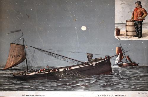 Drukwerk. Schoolplaat met voorstelling de haringvang...