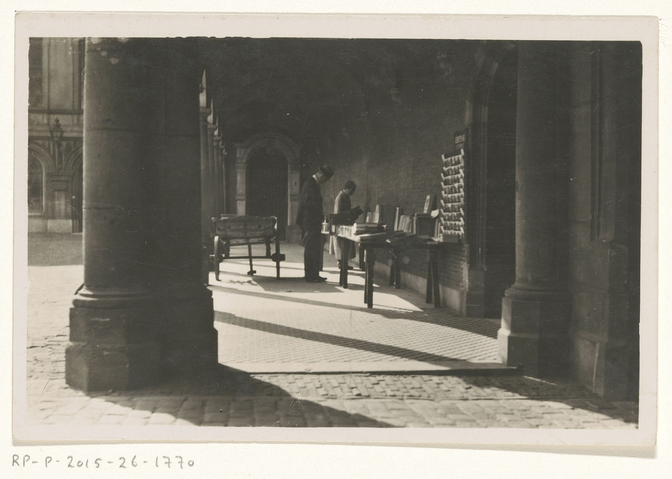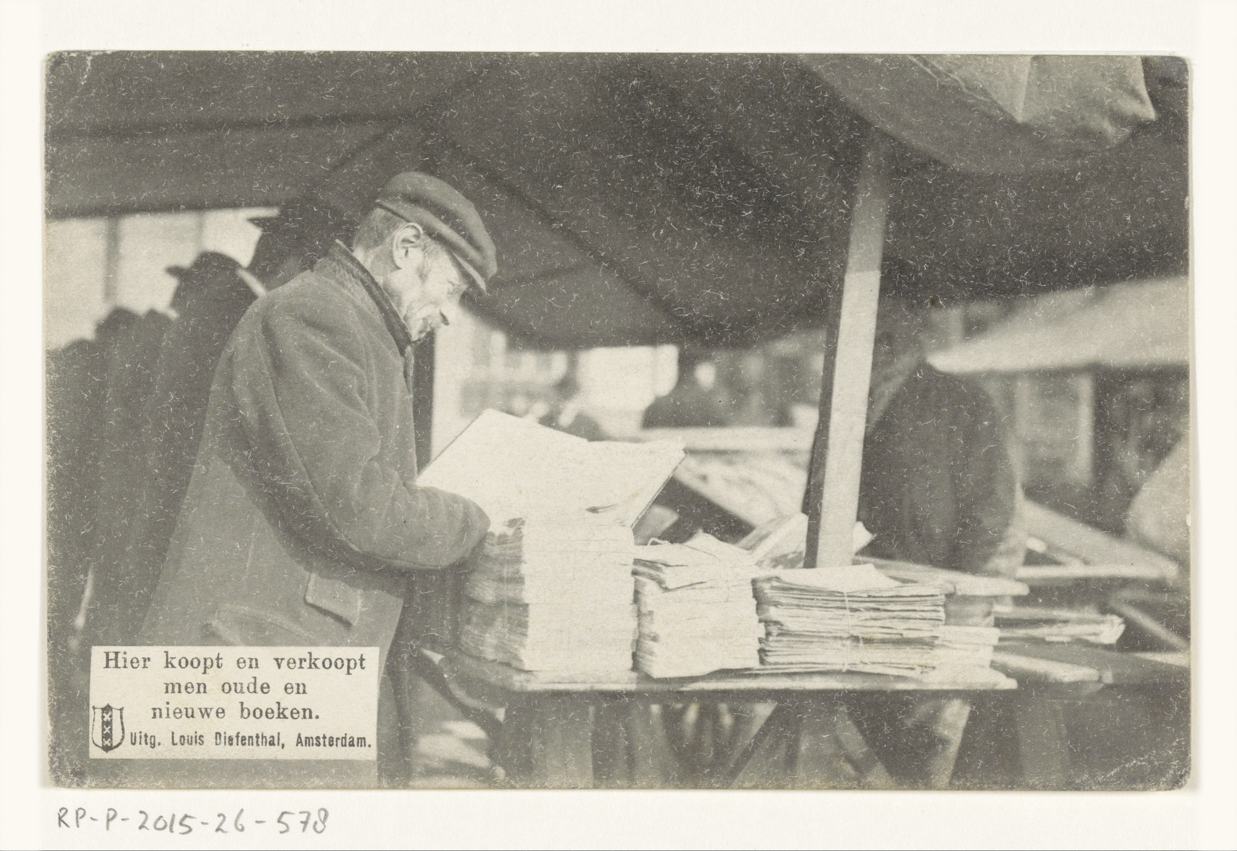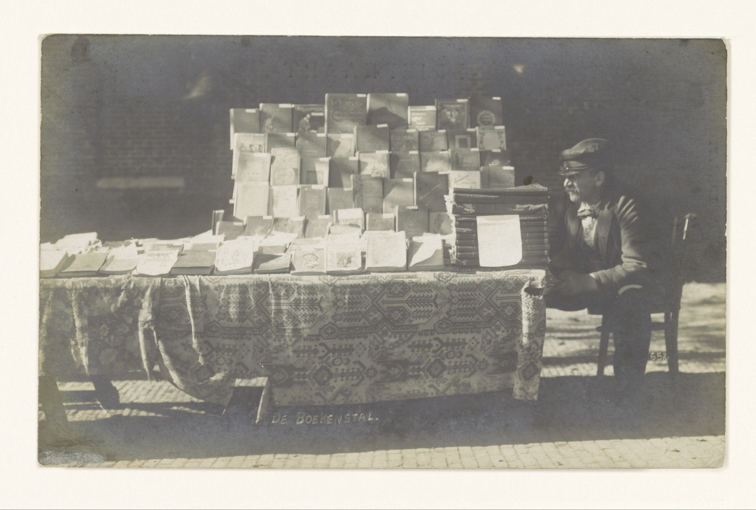 Boekhandelaar Frederik Coster naast zijn boekenkraam...