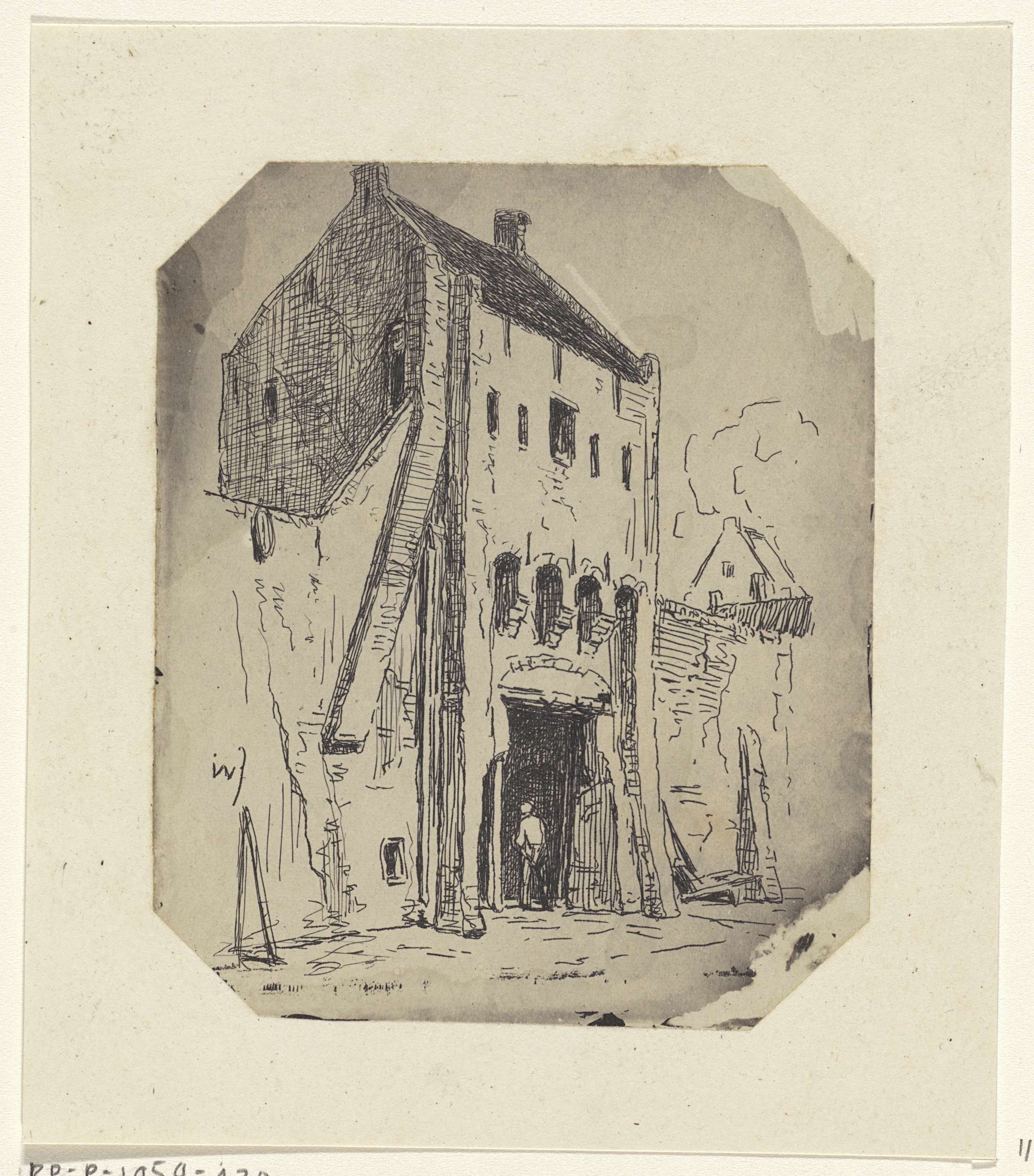Fotoreproductie van een getekend landschap met een k...