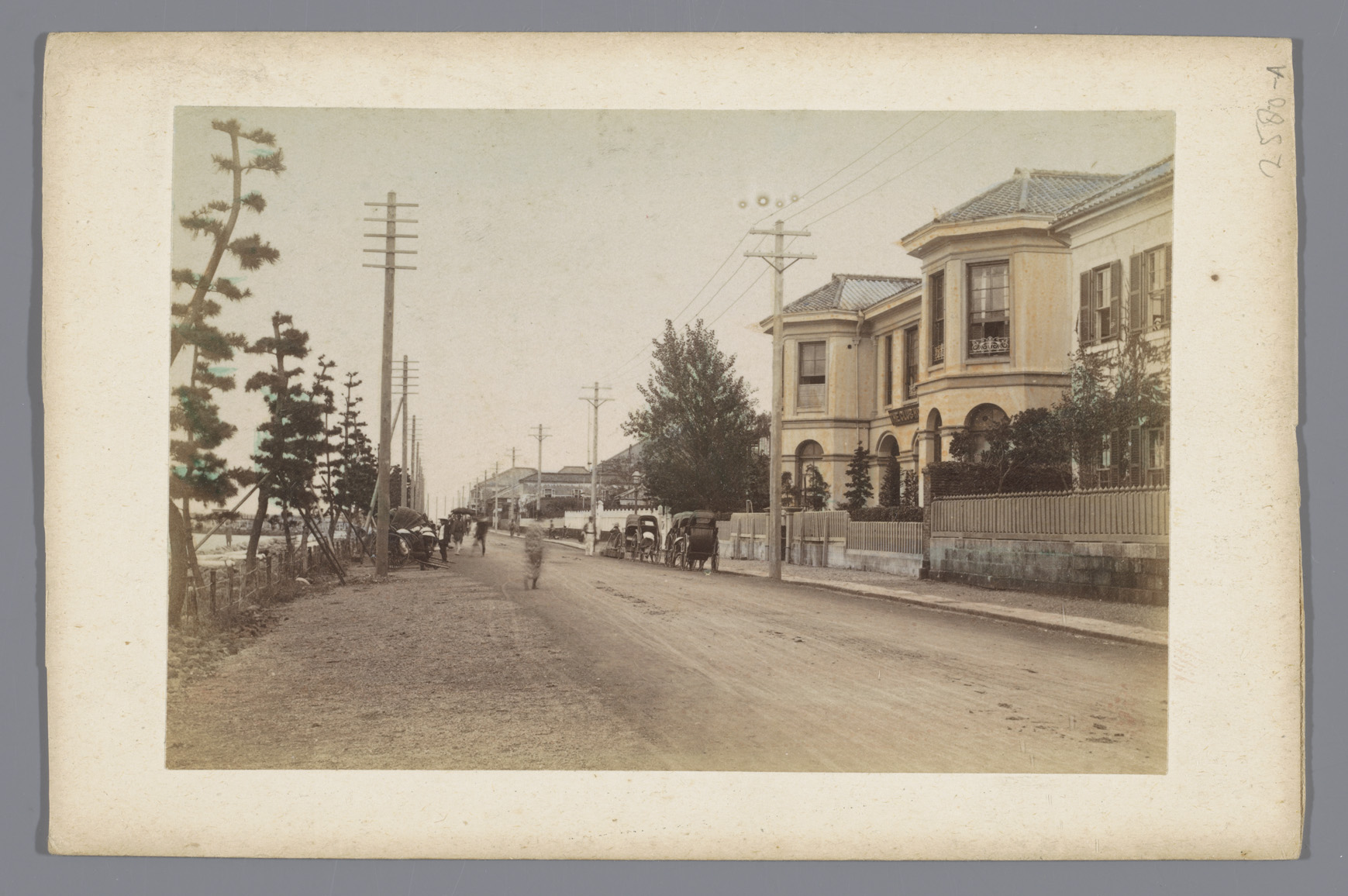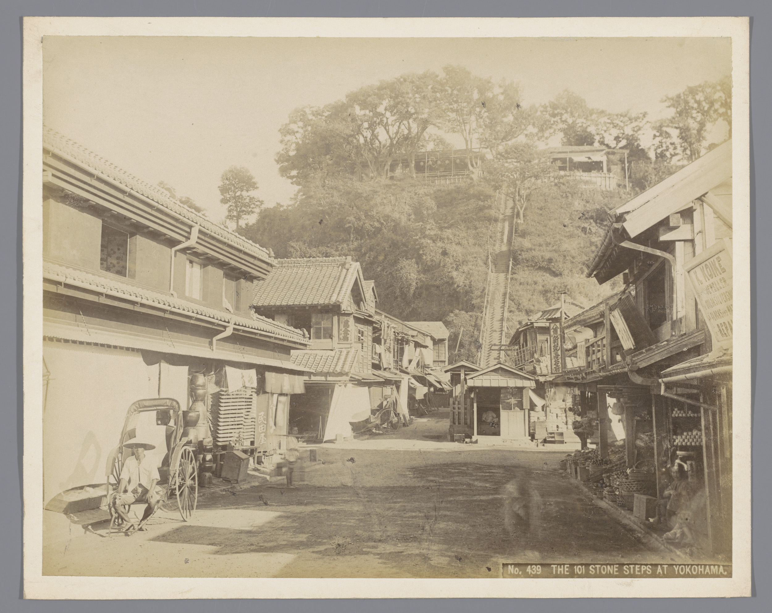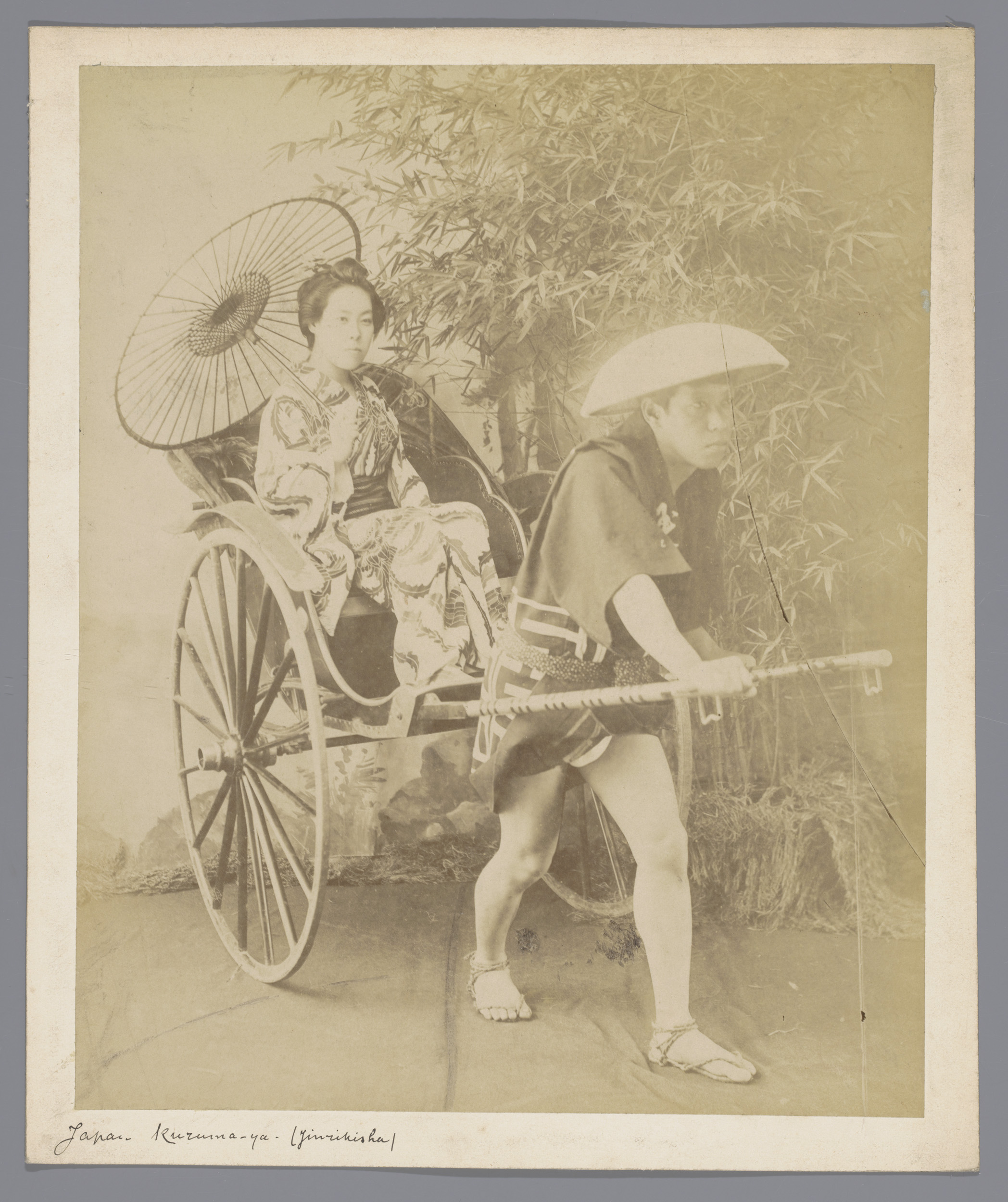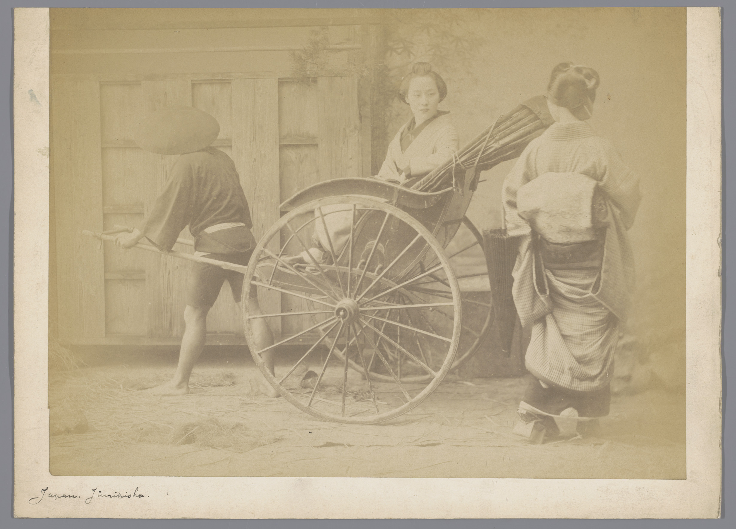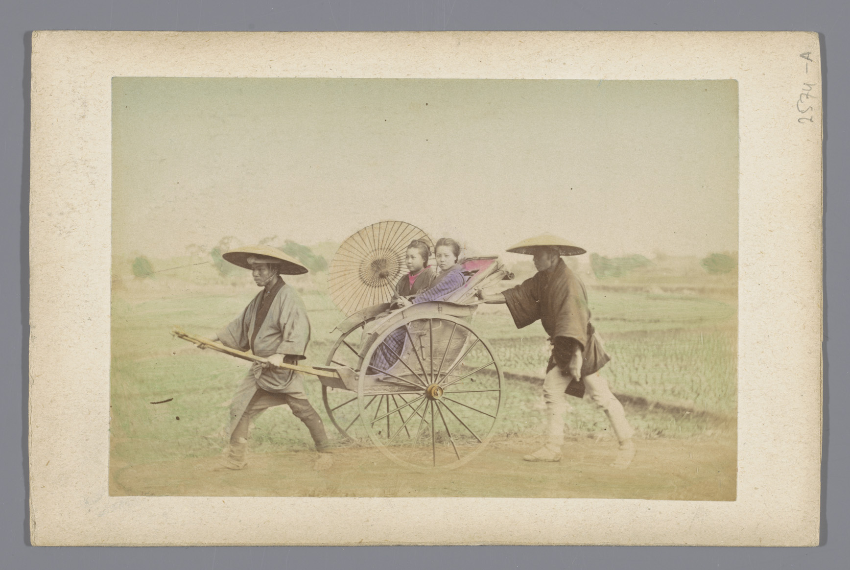 Twee Japanse jonge vrouwen in riksja voortgetrokken ...