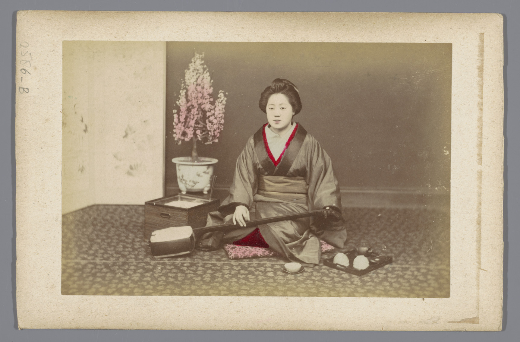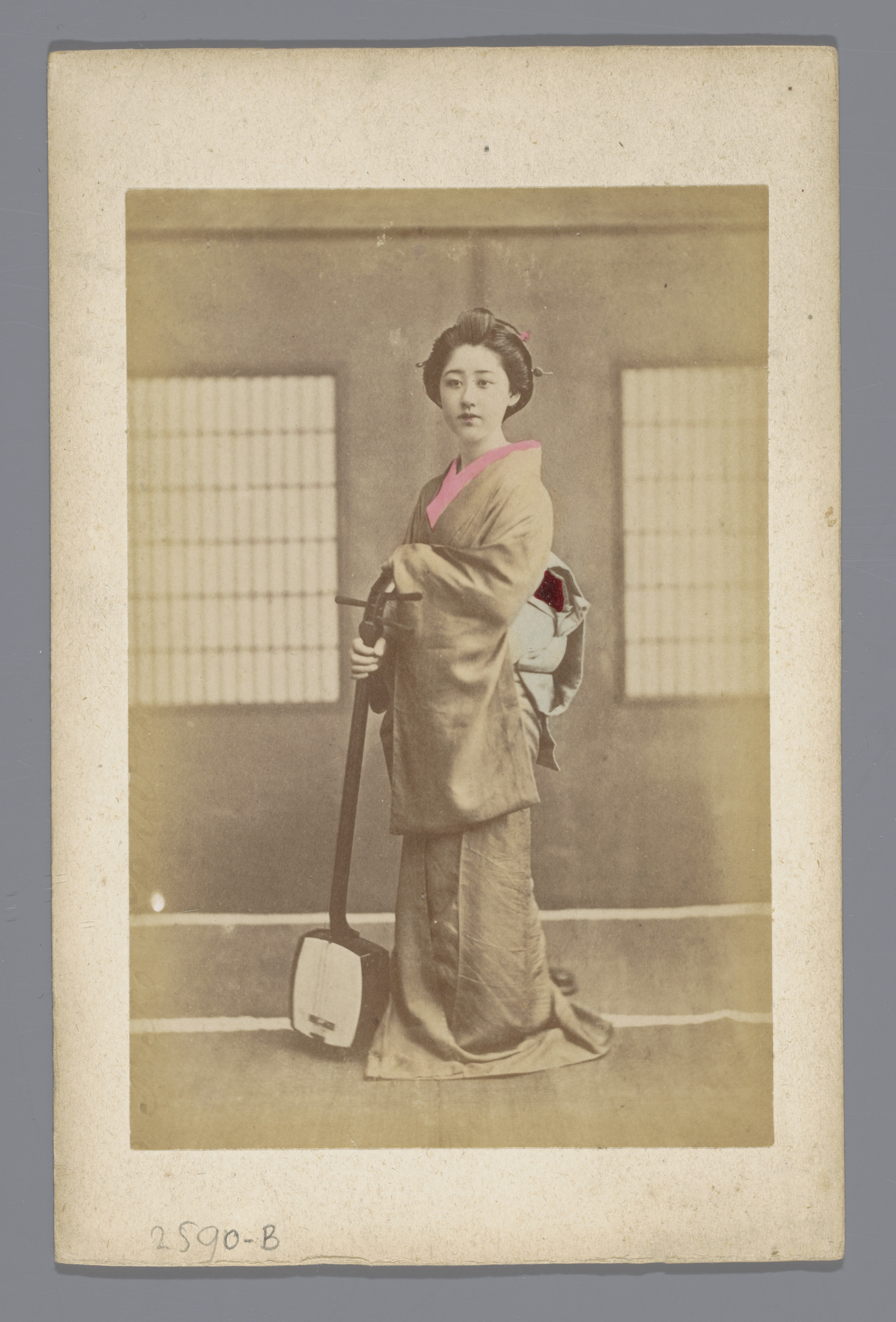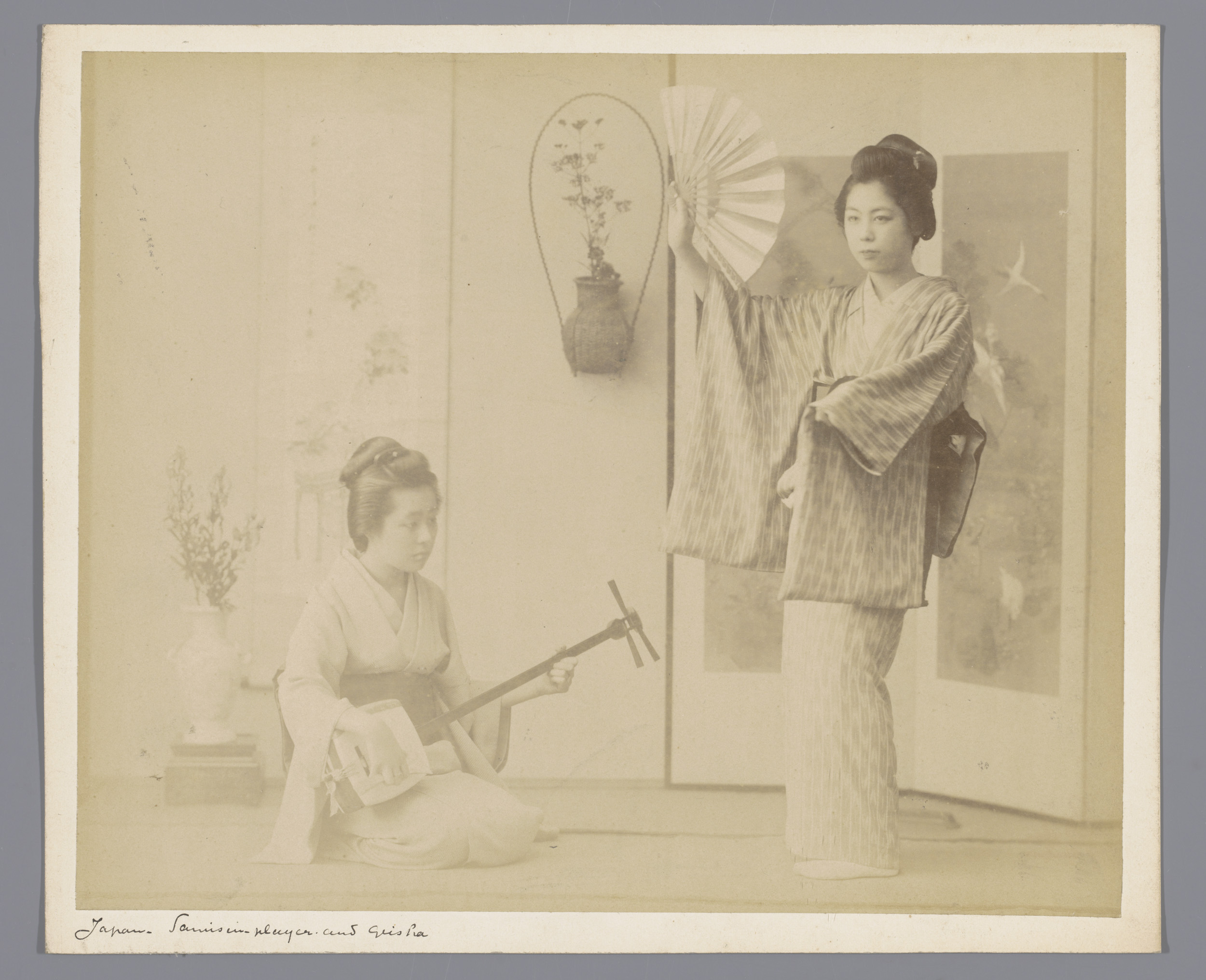 Dubbelportret van een onbekende vrouw met shamisen e...